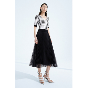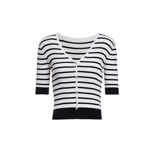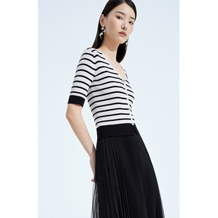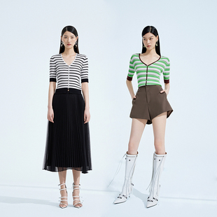 欧时力 短上衣条纹修身 V领短袖 女夏装 针织衫 黑标系列