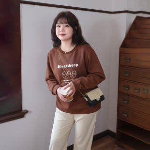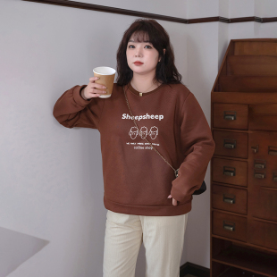 新款 宽松印花加绒卫衣胖MM春季 巨显瘦休闲遮肚上衣 女装 蓝若水大码