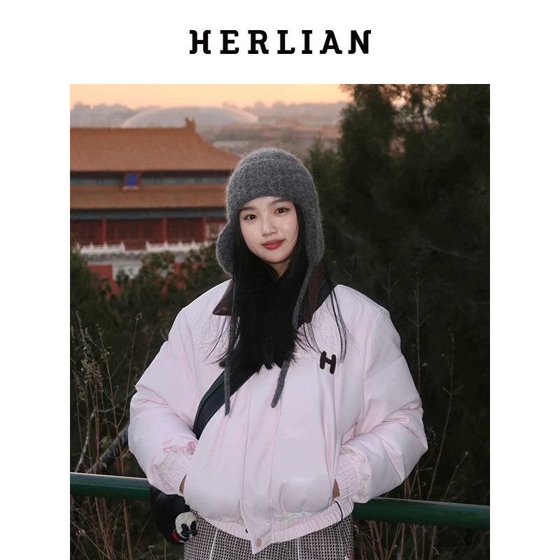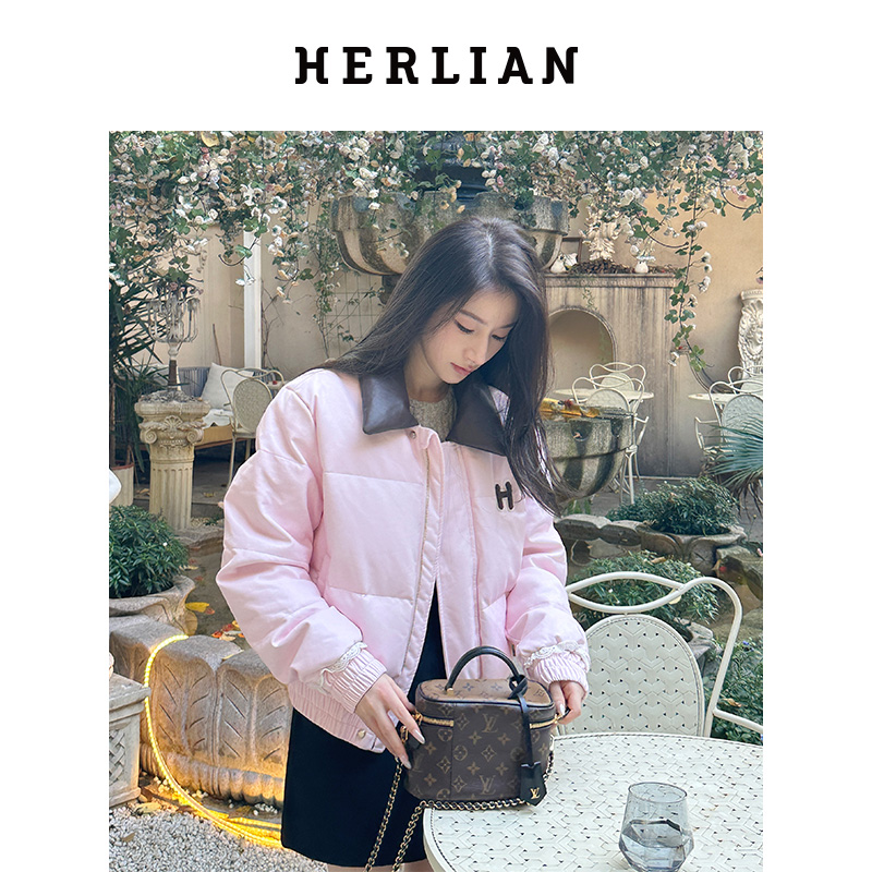 外套女上衣 粉色蕾丝边翻领百搭加厚保暖羽绒服短款 HERLIAN 冬季