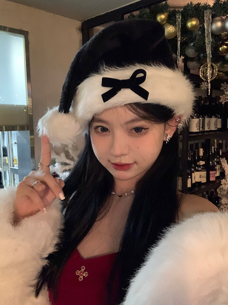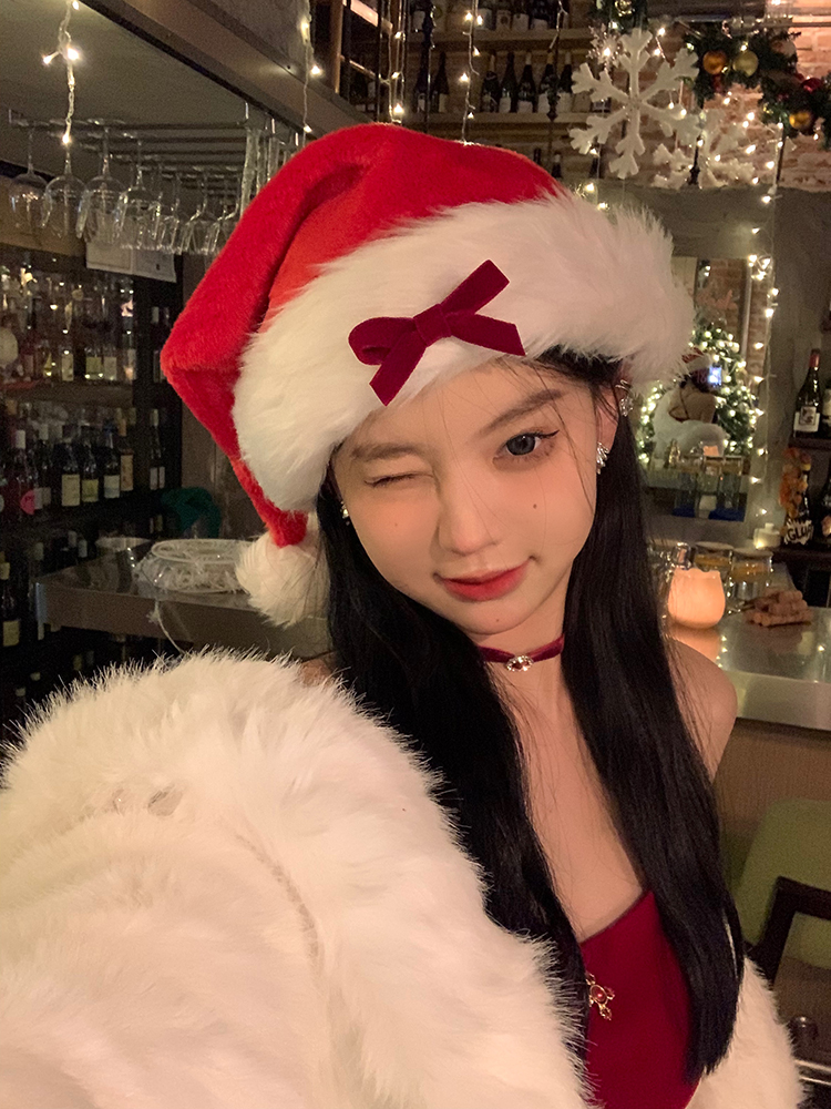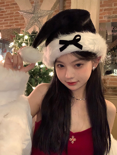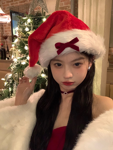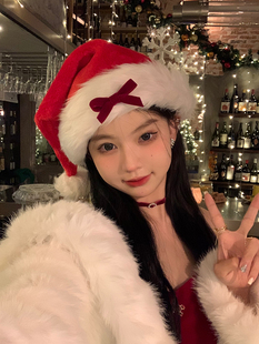 扮穿搭头饰拍照道具 圣诞氛围感红色蝴蝶结圣诞帽节日装 蜜桃茶
