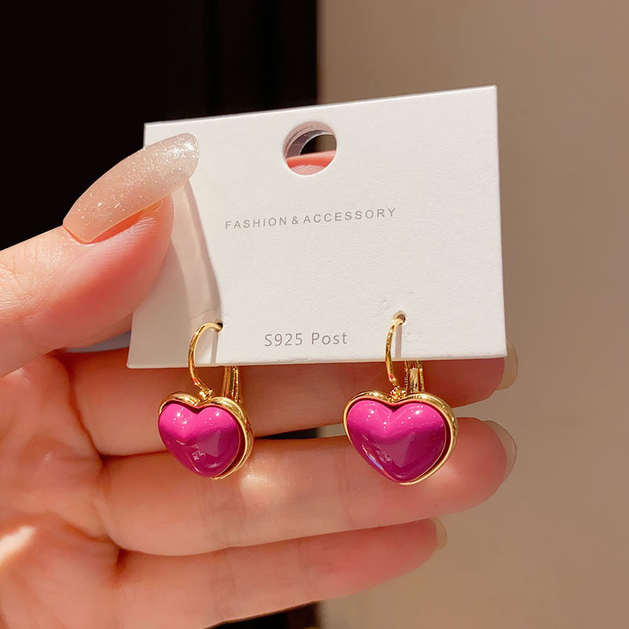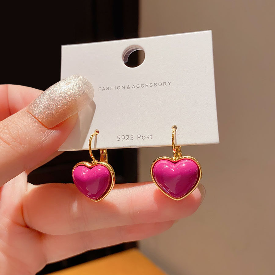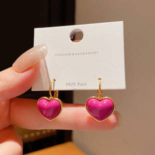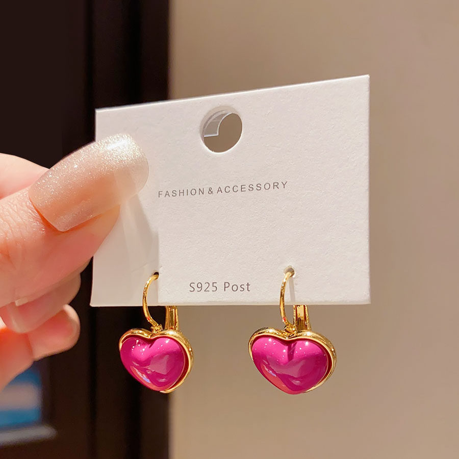 韩式 树脂玫红色爱心耳环夏天女复古百搭简约高级感耳勾型耳饰耳坠