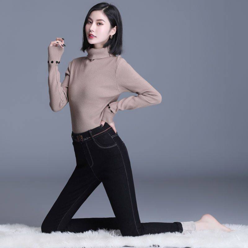 女秋冬高腰显瘦小个子九分法棍烟管裤 拉夏贝尔加绒窄版 直筒牛仔裤