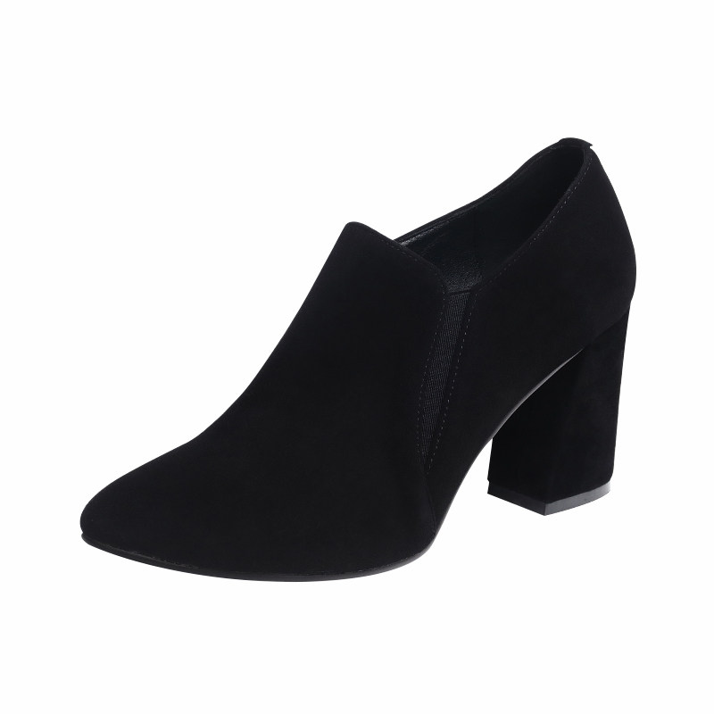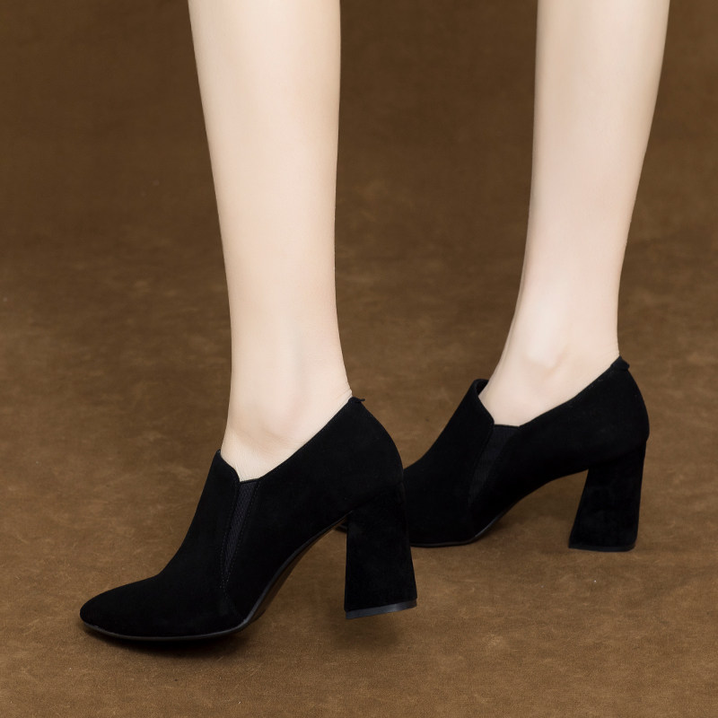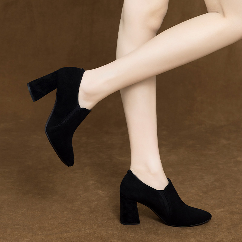 真皮鞋 2025新款 秋冬女鞋 软皮绒面深口单鞋 羊皮气质尖头粗跟高跟鞋