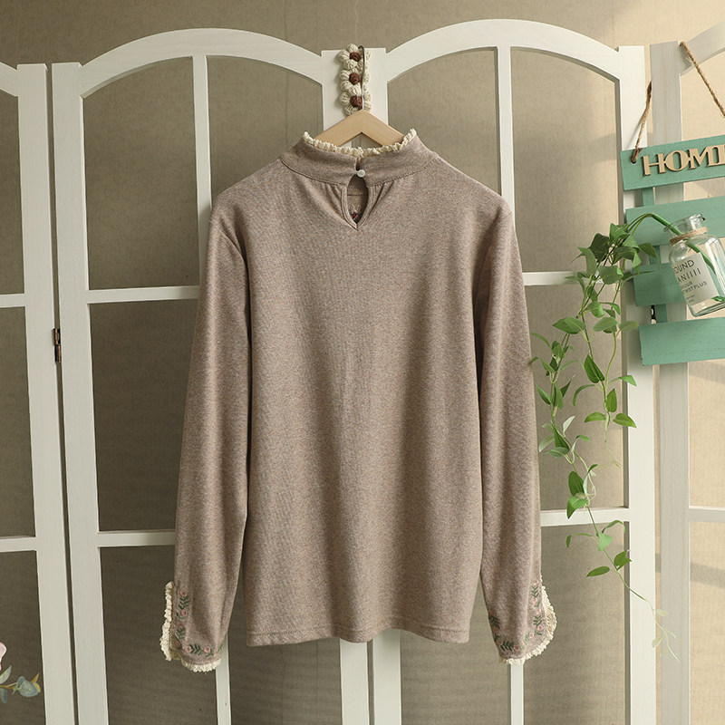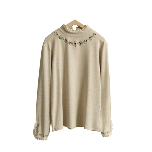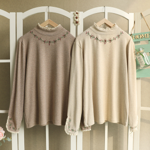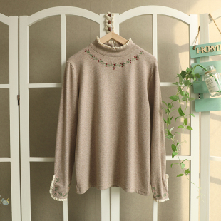 T恤衫 女甜美减龄柔软舒适棉质长袖 森系绣花花边半高领打底衫 新款