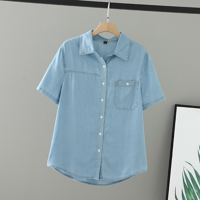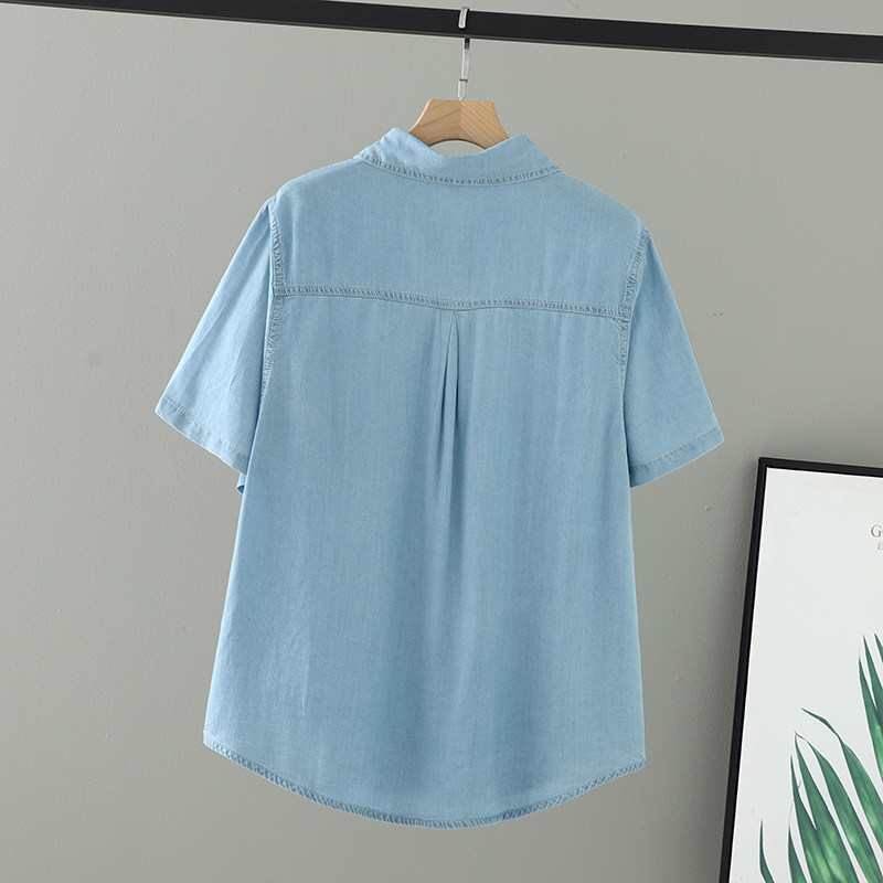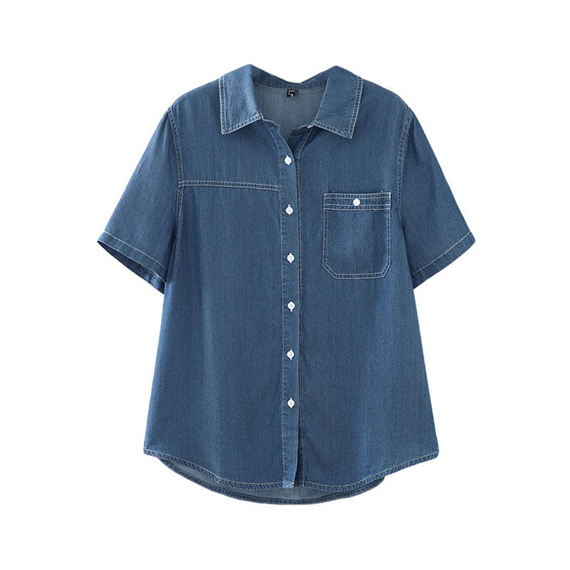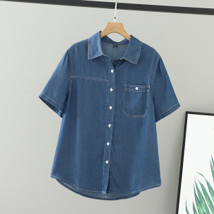 胖mm女装 女衬衫 夏装 单口袋别致上衣宽松翻领牛仔短袖 大码 2026新款