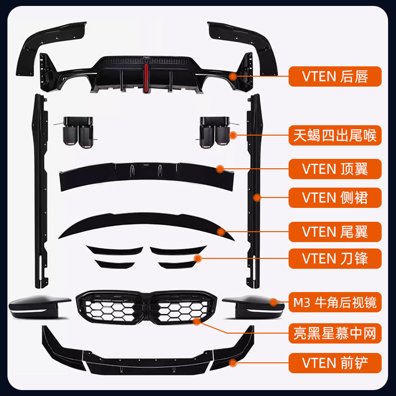 适用宝马新3系改装 件 VTEN后唇前铲侧裙尾翼四出尾喉风刀三系改装