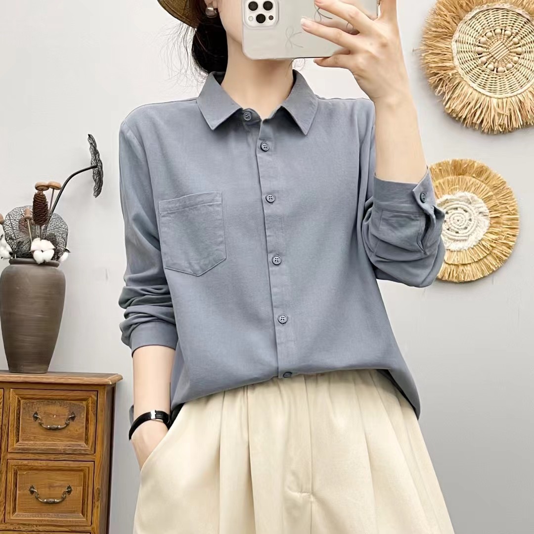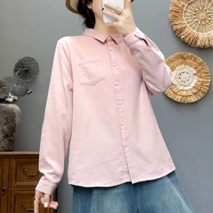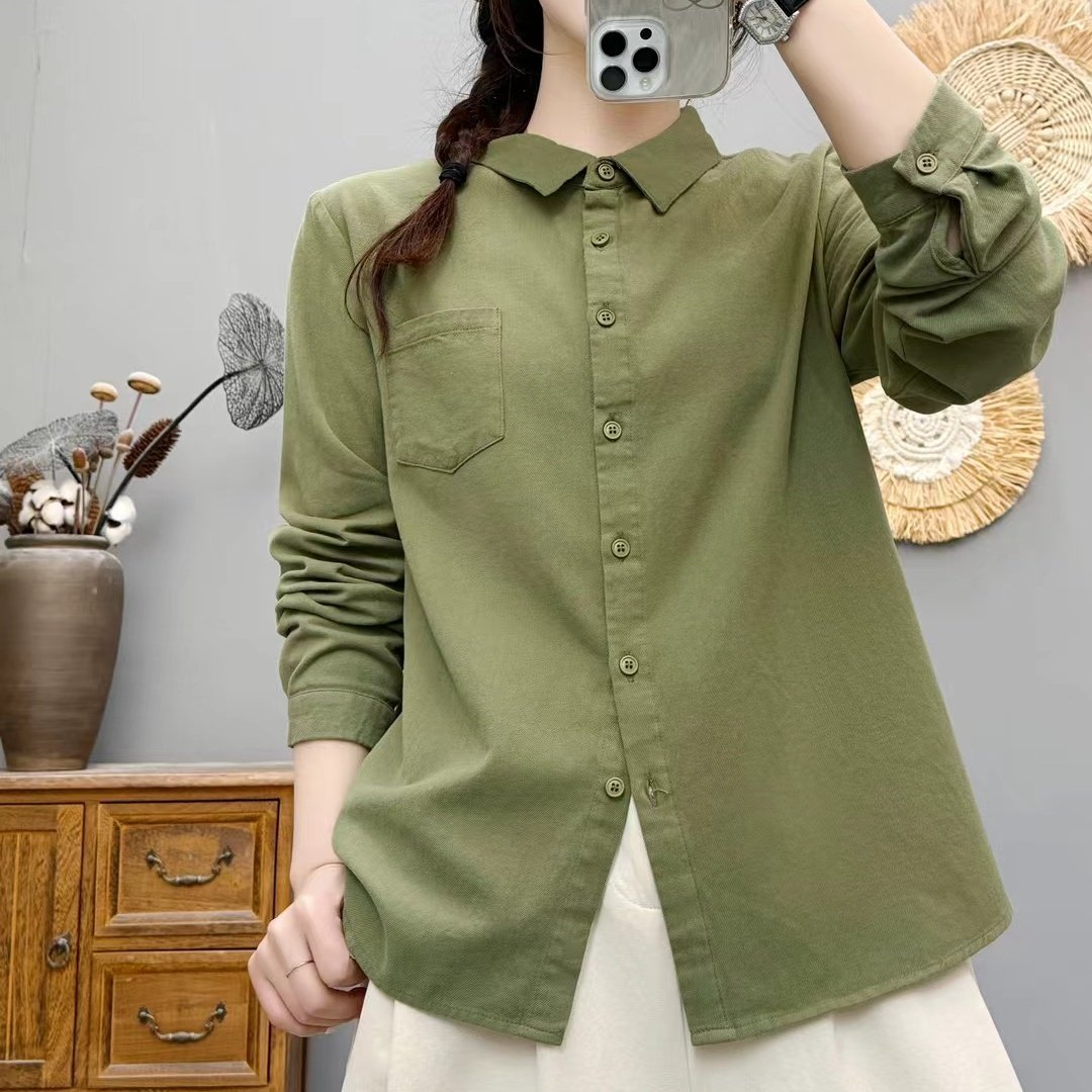 衬衫 秋季 纯棉磨毛长袖 薄款 女宽松显瘦休闲百搭方领衬衣上衣 新款