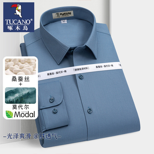 男桑蚕丝抗皱免烫薄款 衬衫 蓝色职业上班宽松衬衣 长袖 啄木鸟春秋款