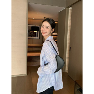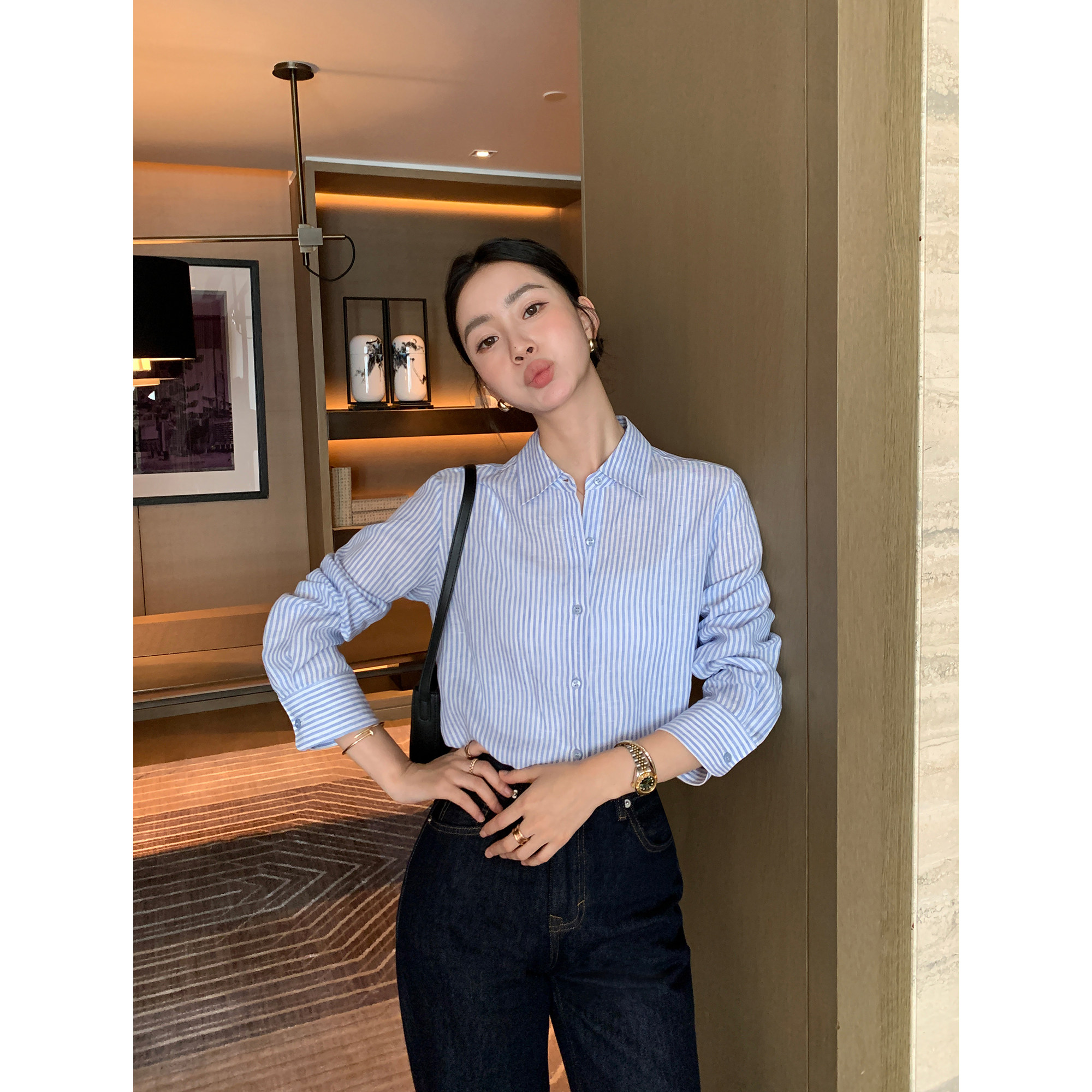 上衣女韩系设计感宽松亚麻衬衣开衫 Maven 衬衫 蓝白条纹长袖 Lin