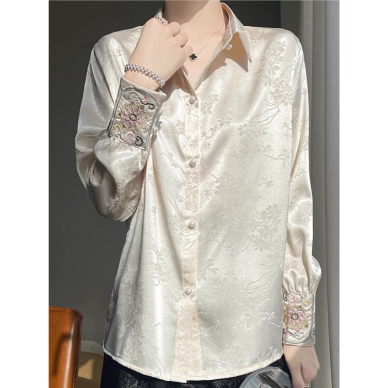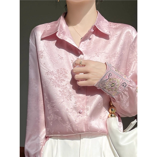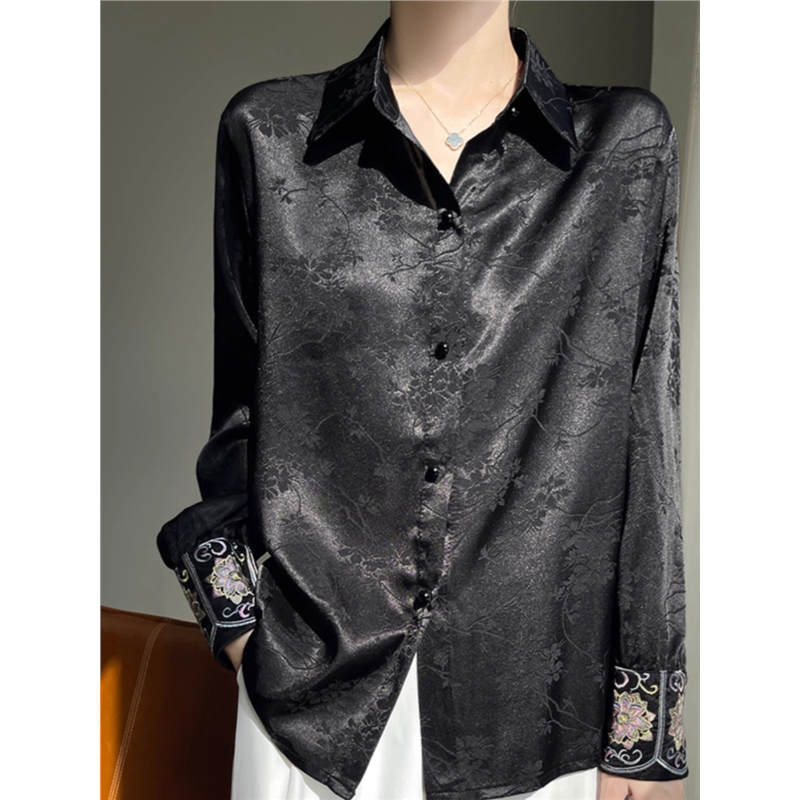 上衣设计长袖 新中式 复古国风唐装 女2024新款 衬衣 醋酸缎面提花衬衫