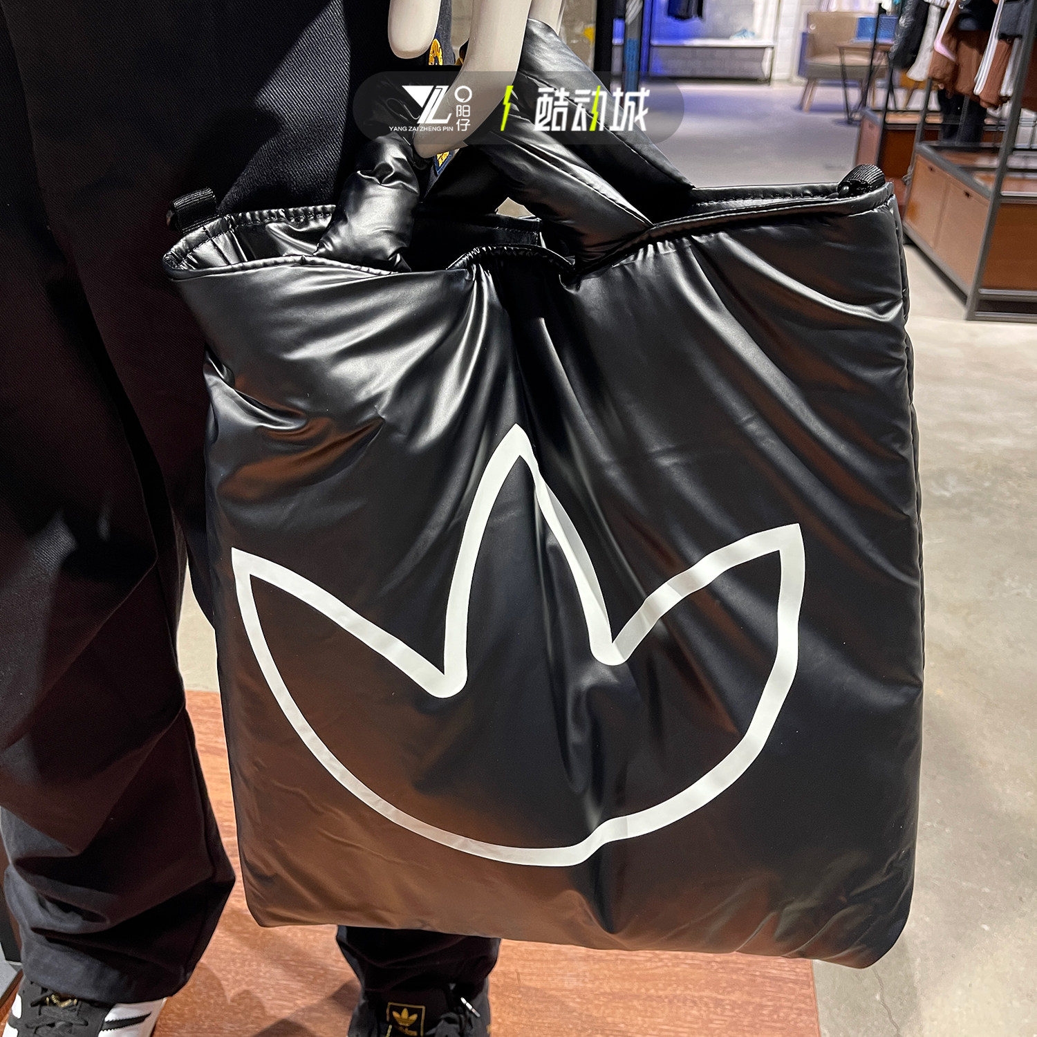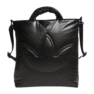 阿迪达斯三叶草男女同款 黑色亮面托特包电脑包大容量单肩包JW1715
