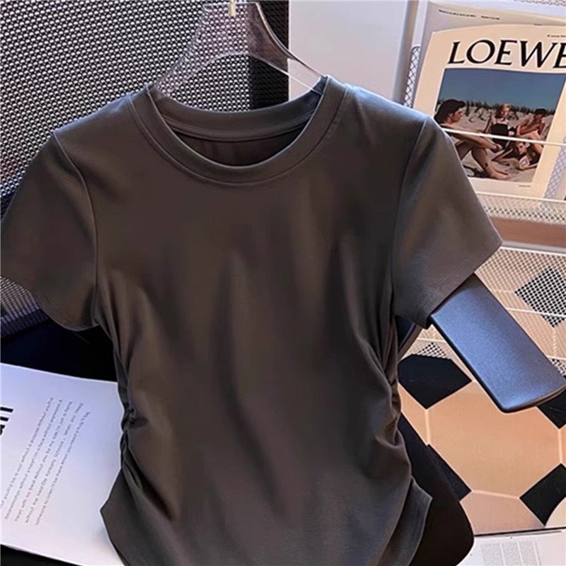 弧形下摆体恤 款 设计感小众褶皱收腰上衣不规则短袖 t恤2024女夏季