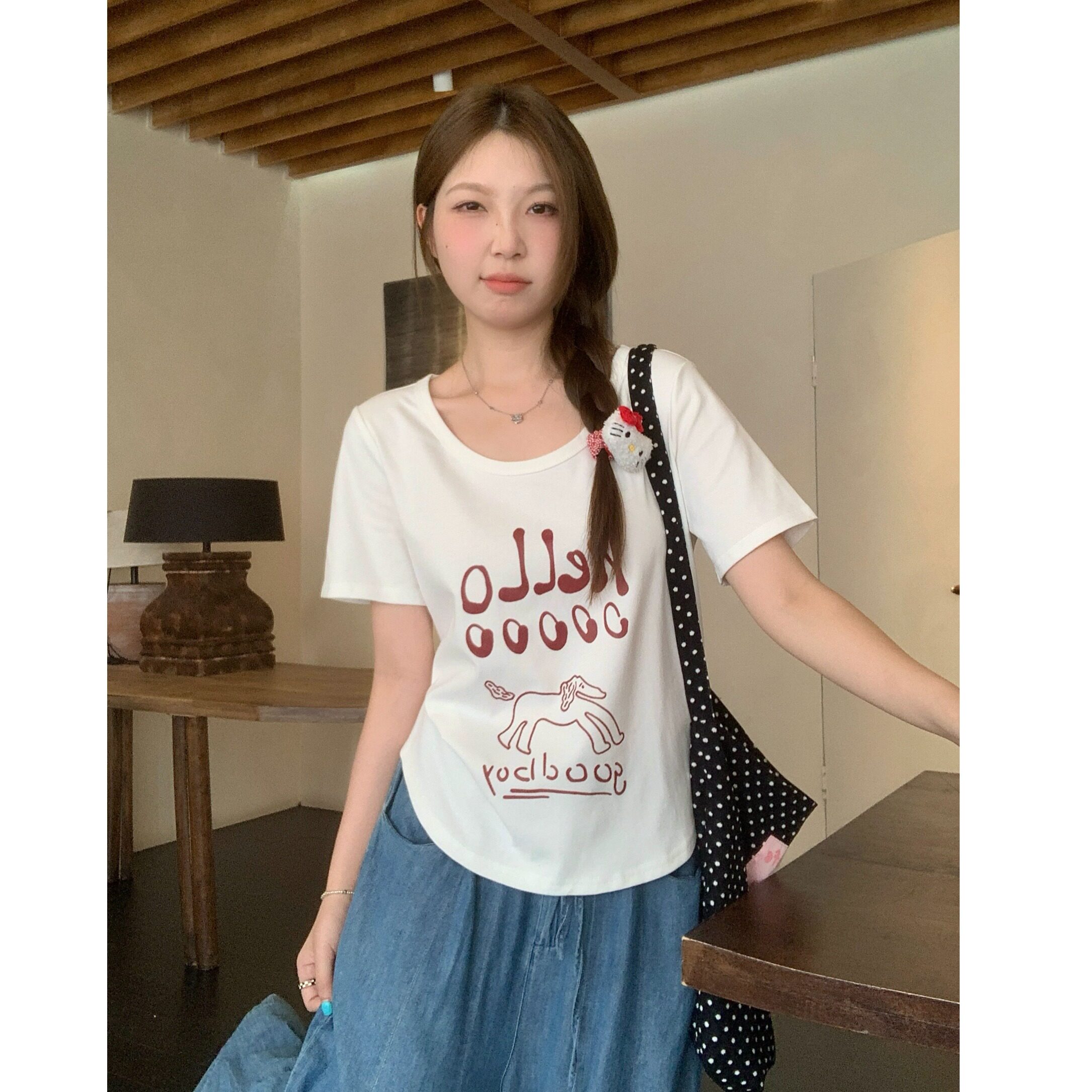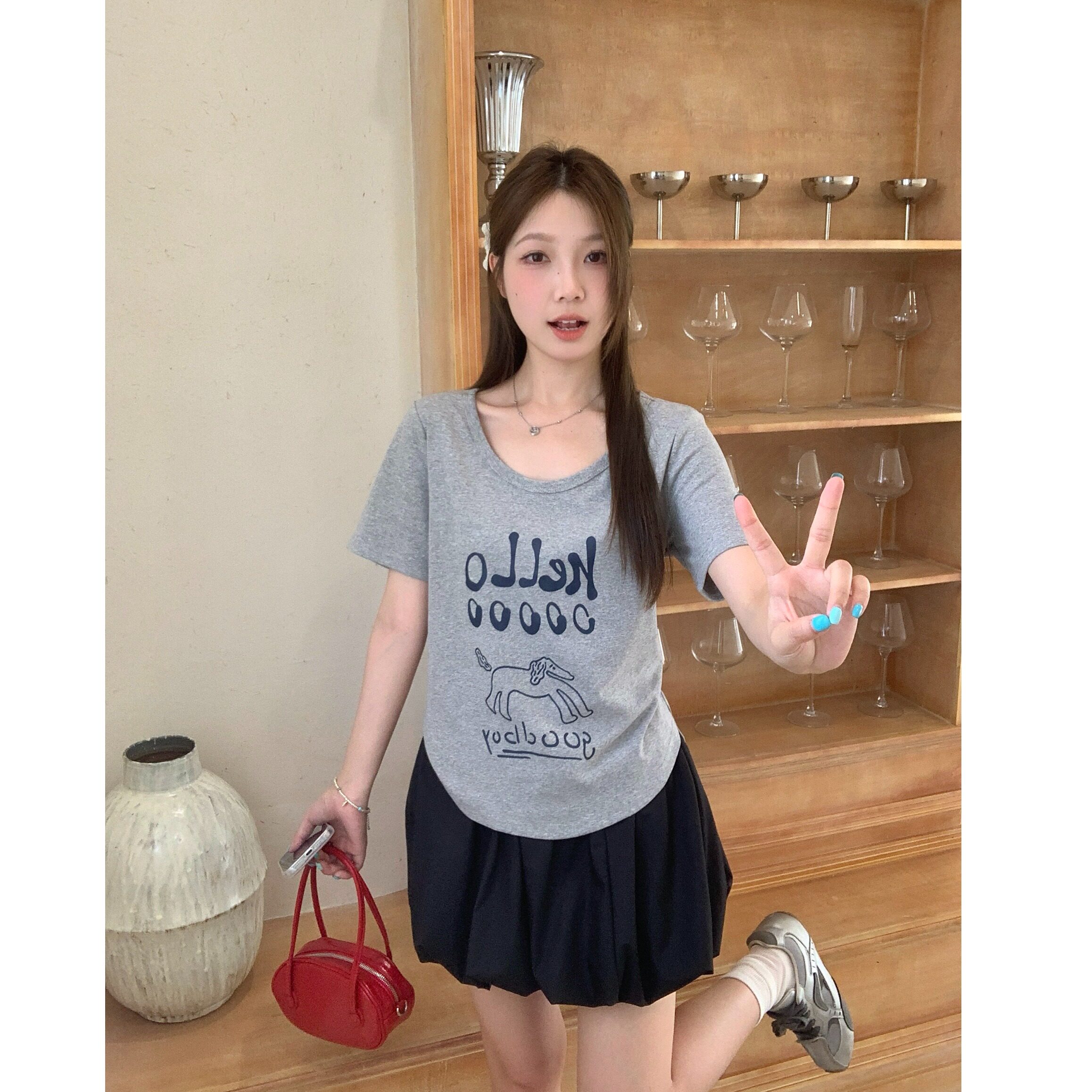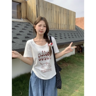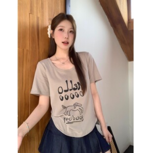 胖mm韩系慵懒正肩短袖 夏装 T恤印花显瘦百搭上衣女 女装 小吉家大码