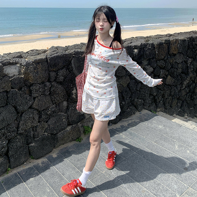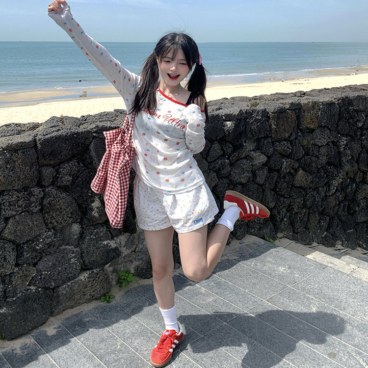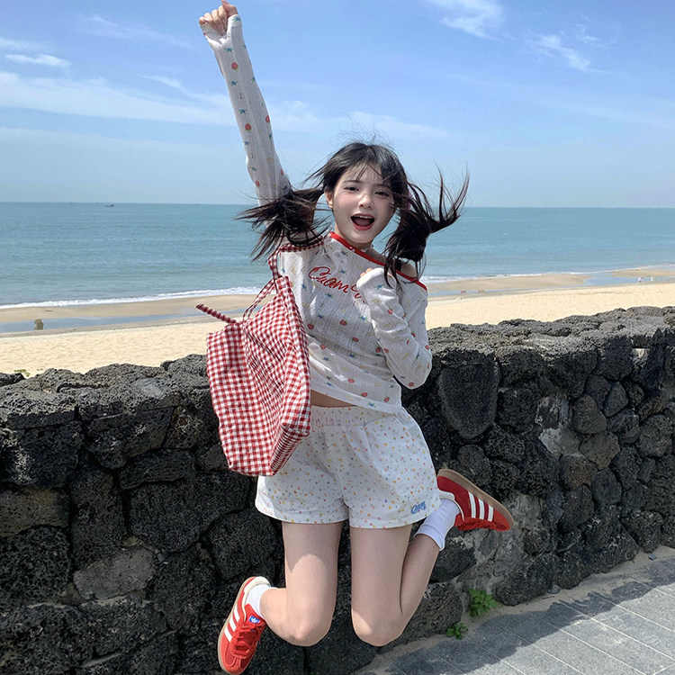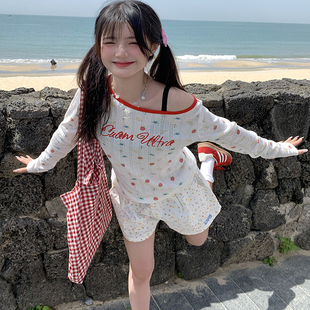 薄款 星星波点印花防晒长袖 T恤女夏季 辣妹短款 GTGA 斜肩罩衫 美式
