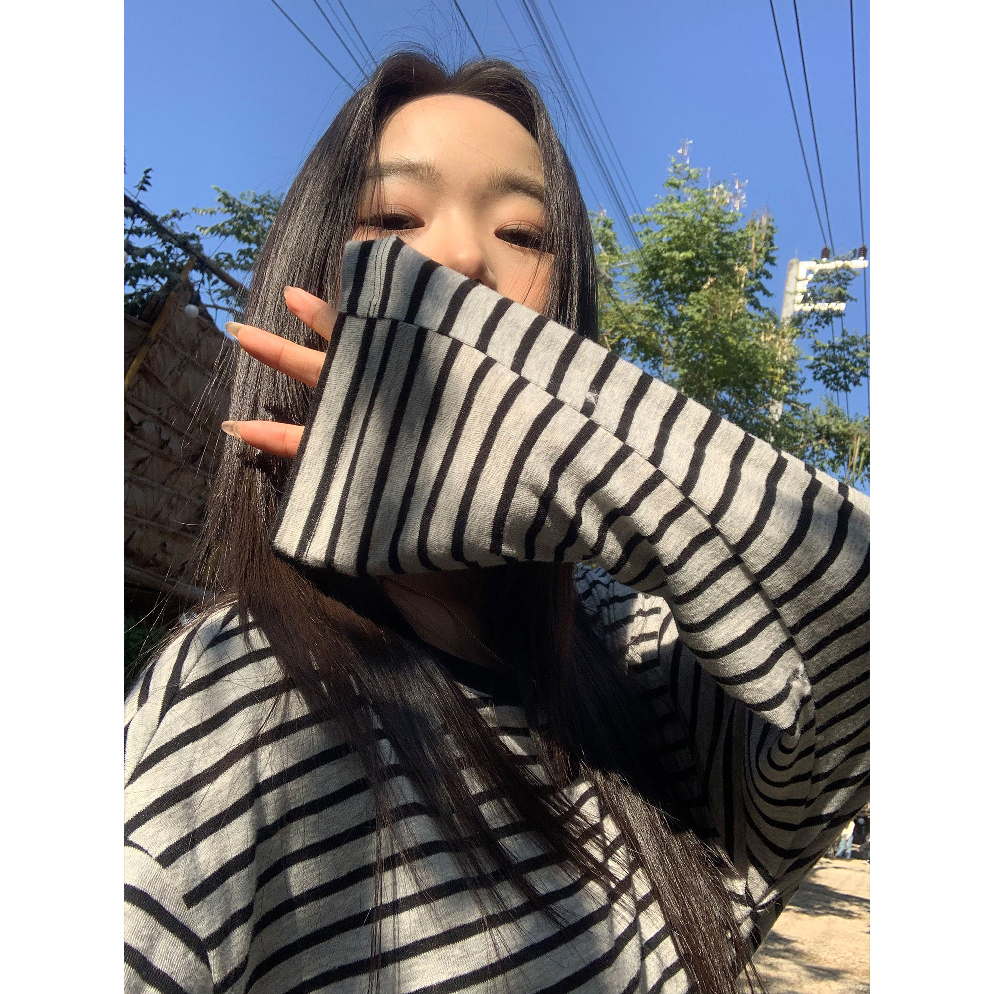 防晒罩衫 pusumede t恤女薄款 斜肩条纹长袖 oversize上衣 松弛系列