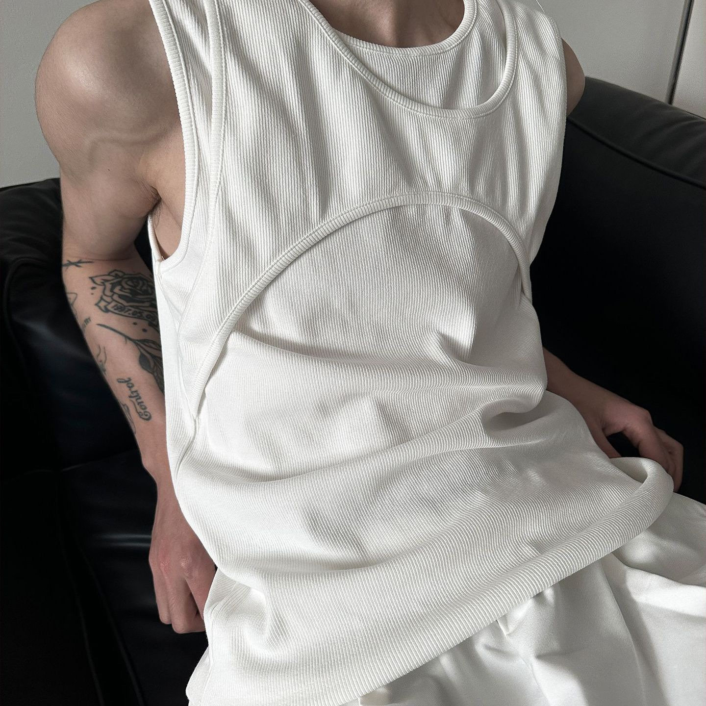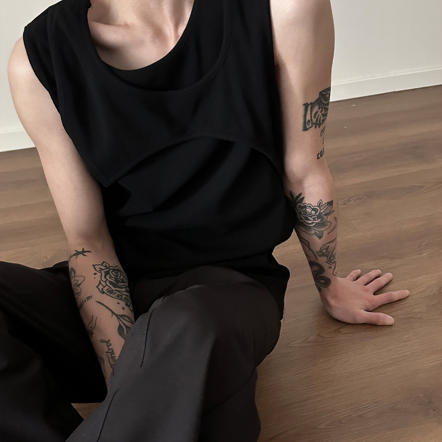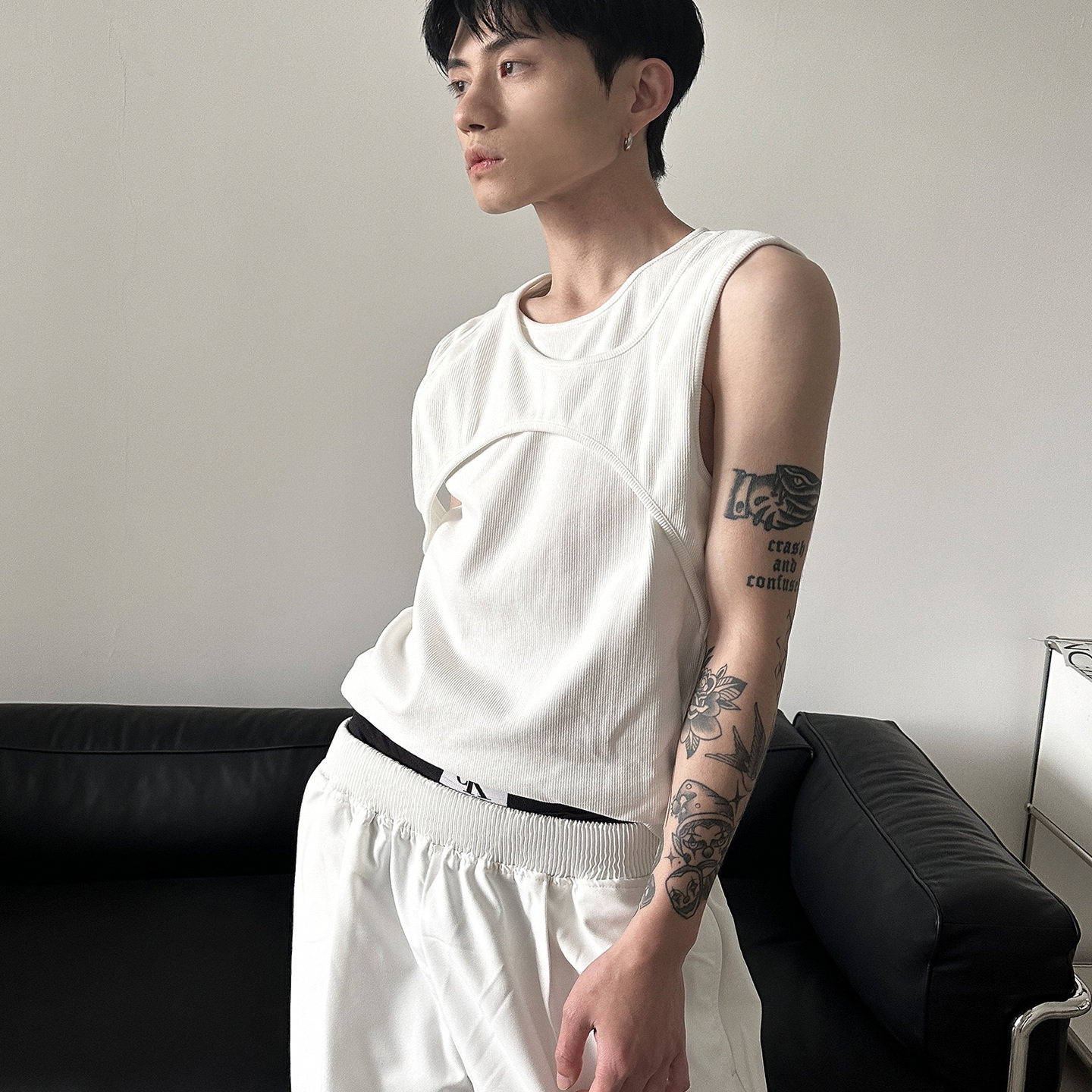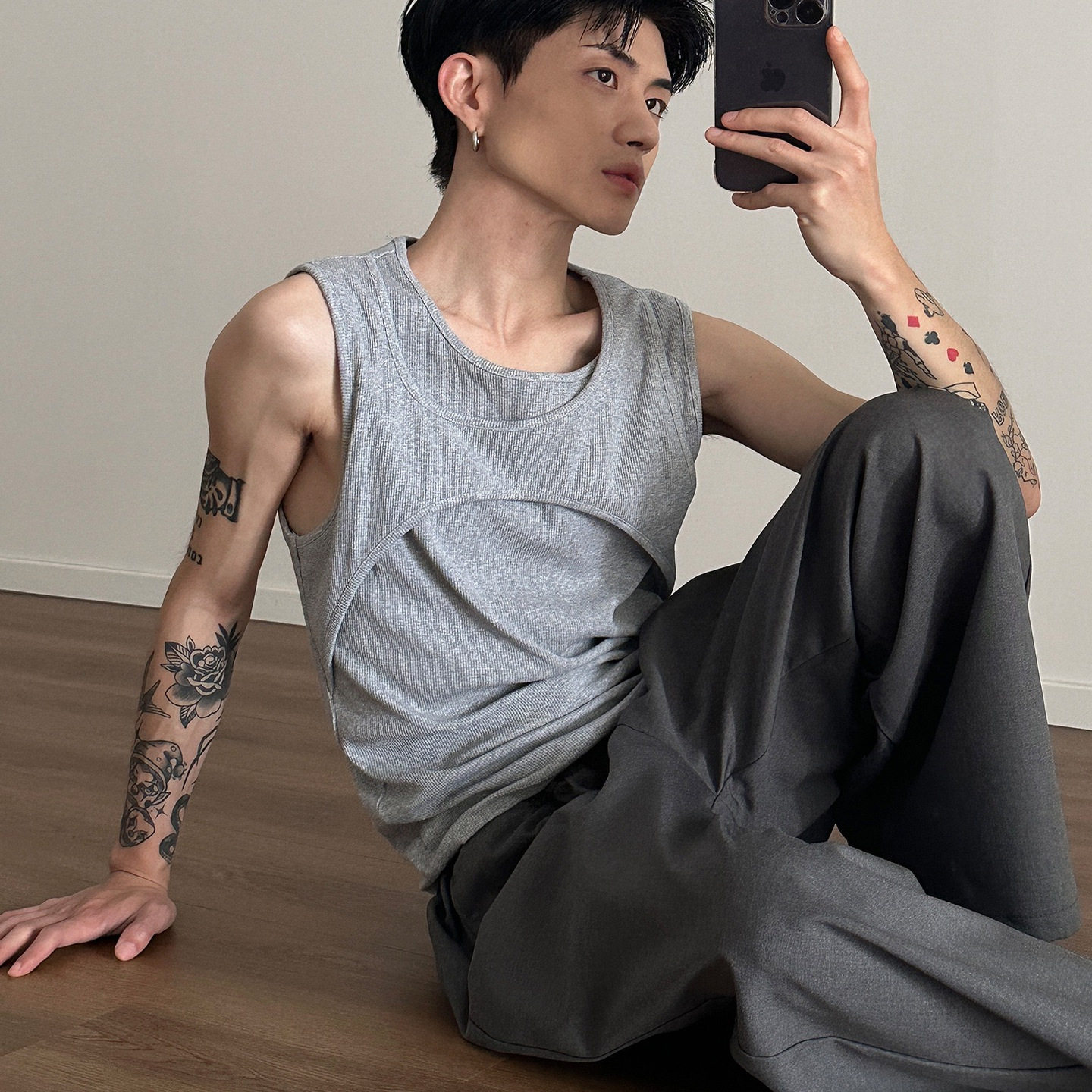 潮 T恤设计感打底衫 夏季 层次感解构假两件工字背心男慵懒运动无袖