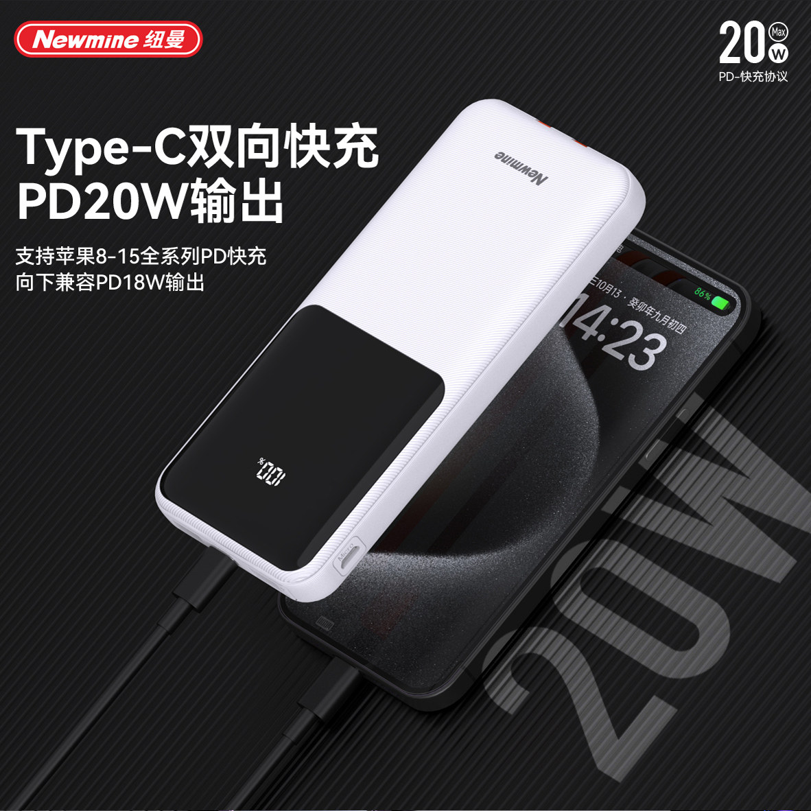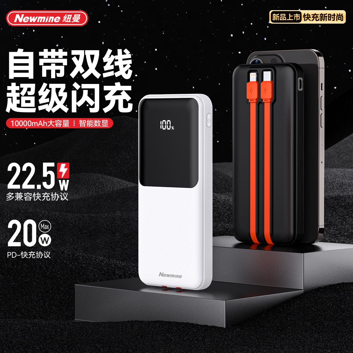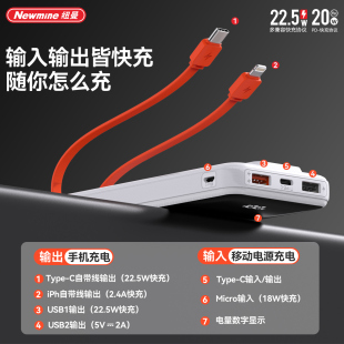 纽曼充电宝自带线10000毫安2万便携移动电源22.5WPD20W快充上飞机