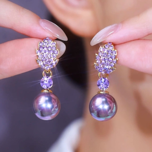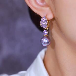 MEILAIFUREN紫色满钻树叶珍珠耳环女高奢定制气质银针耳饰耳坠女