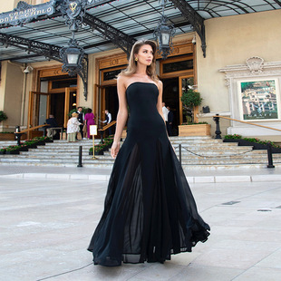 instahot 御姐风拼接收腰开叉长裙 轻熟风蕾丝黑色连衣裙性感时尚