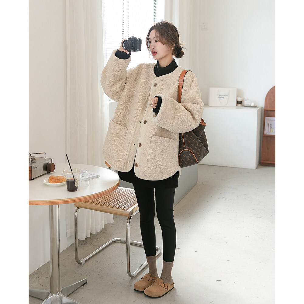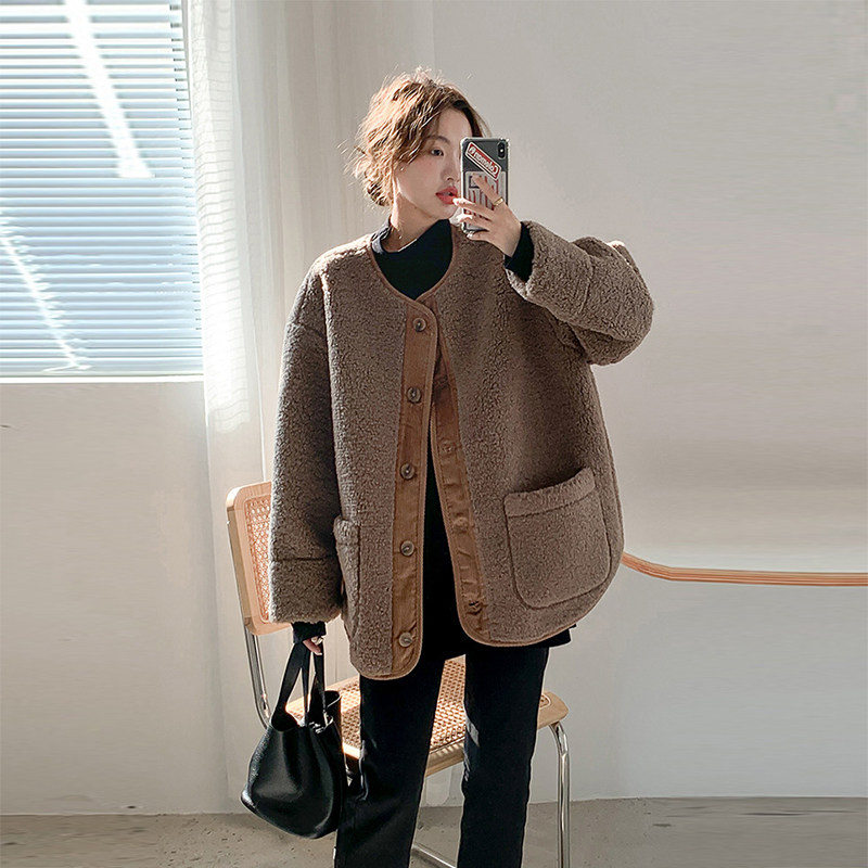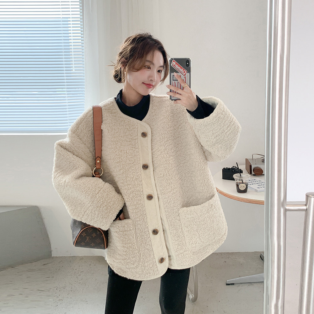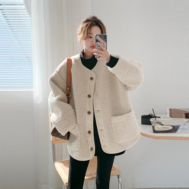 休闲大码 秋冬保暖羊羔毛外套韩版 宽松加厚绒上衣 孕妇装 温暖奶杏