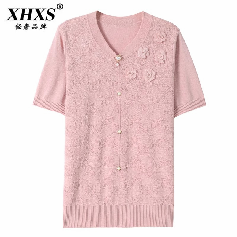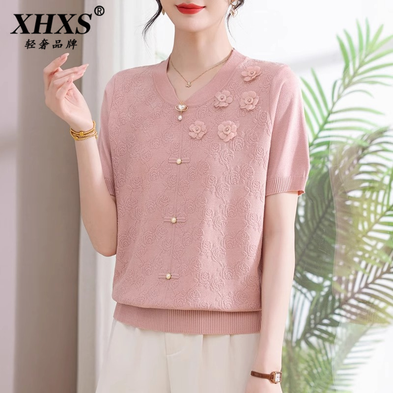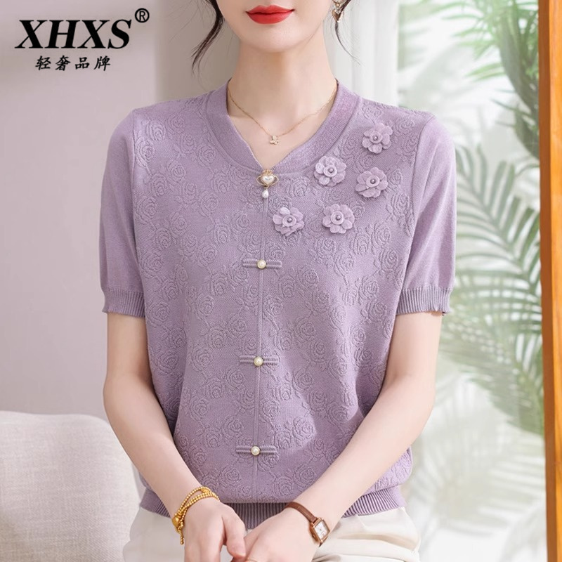 T恤小衫 短袖 2025新款 女高端时尚 妈妈夏装 冰丝减龄上衣套装 时尚