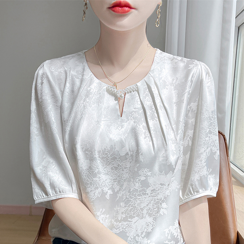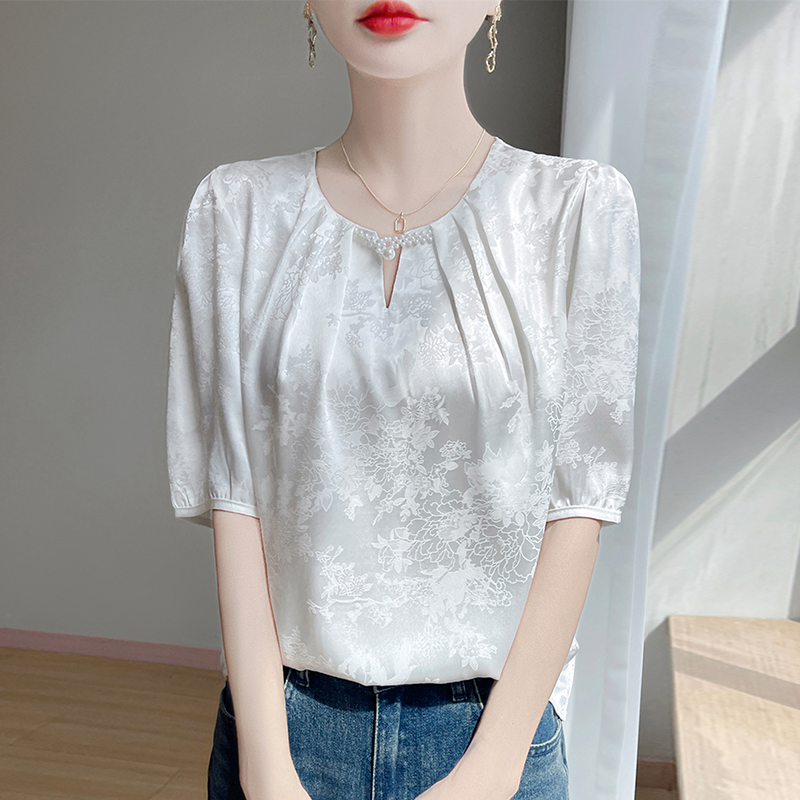 上衣提花新中式 国风小衫 缎面时尚 雪纺衫 t恤 2025夏季 正肩短袖 新款
