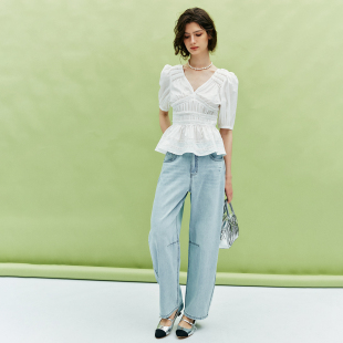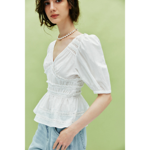 法式 1OO%棉 气质泡泡袖 捏褶V领木耳边五分袖 女 现货 衬衫 宫廷风