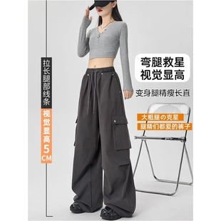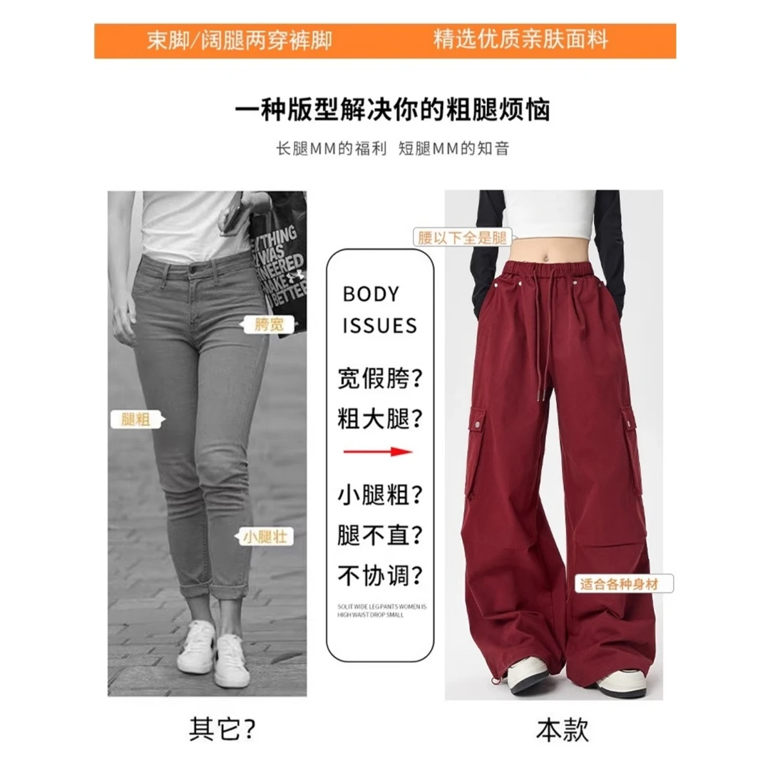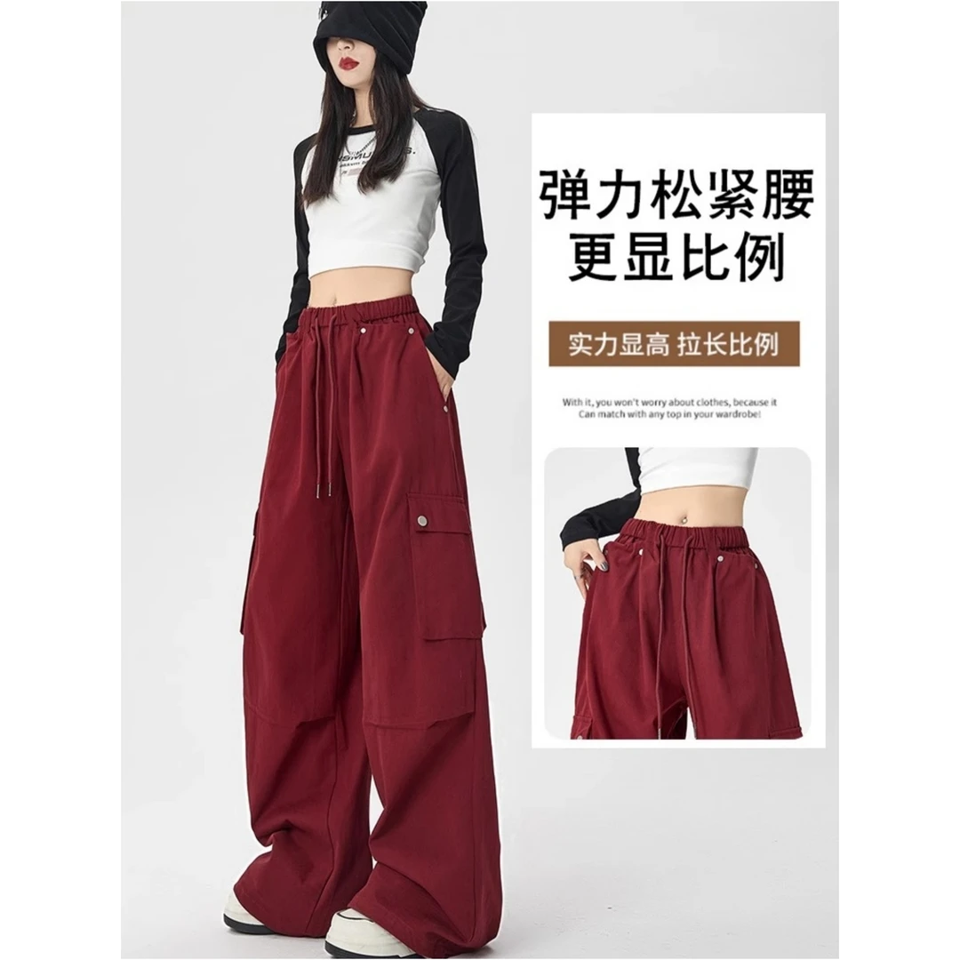 2025新款 女夏季 高腰宽松阔腿降落伞裤 美式 子 安可拉红工装 运动裤 裤