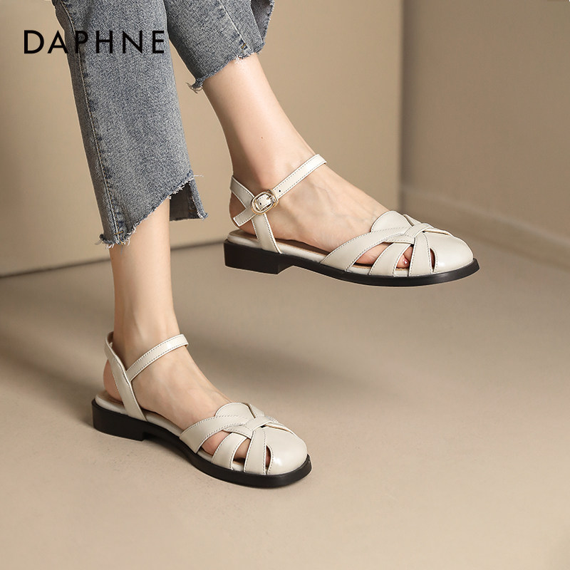 女夏季 夏款 平底包头2026新款 镂空女鞋 外穿法式 达芙妮真皮罗马凉鞋