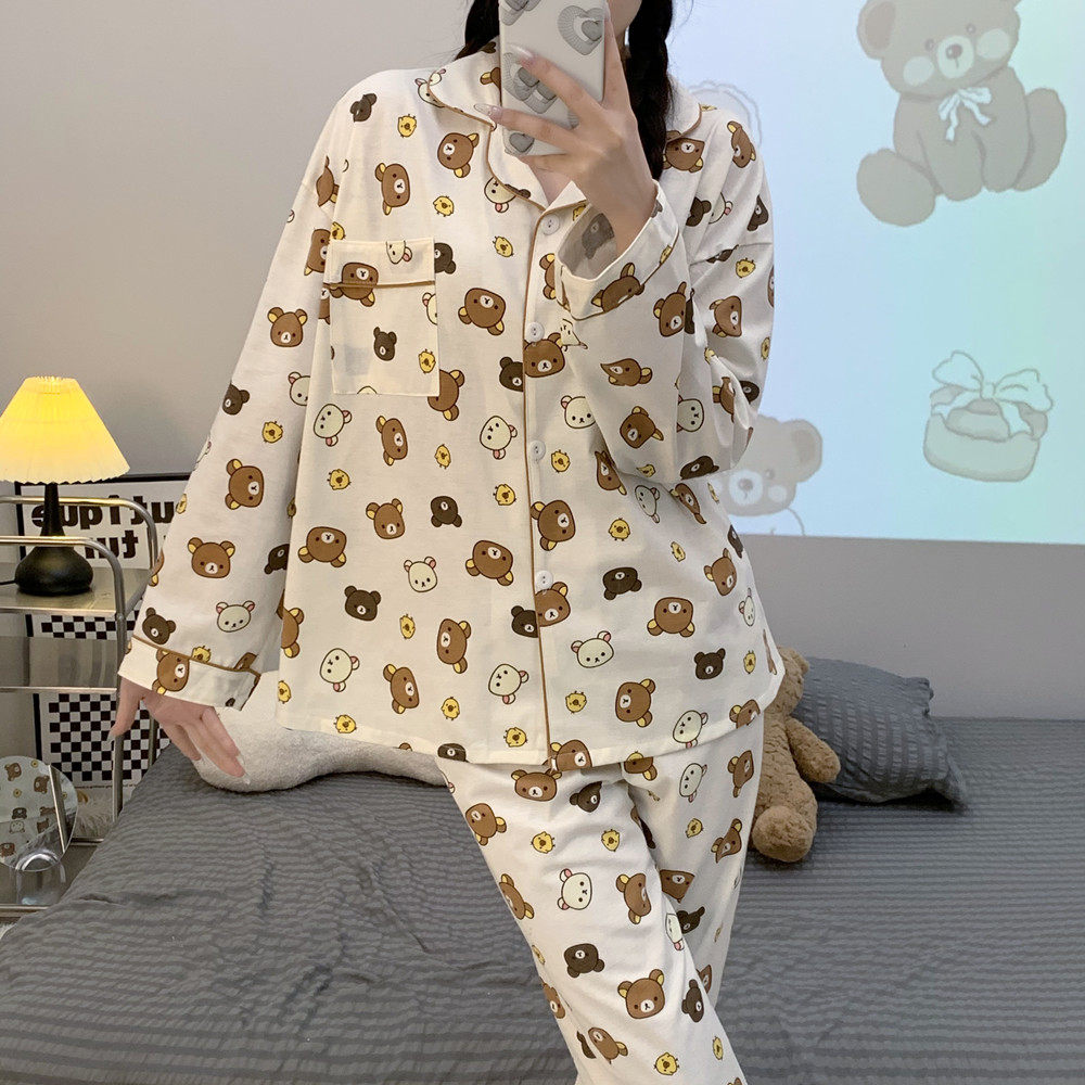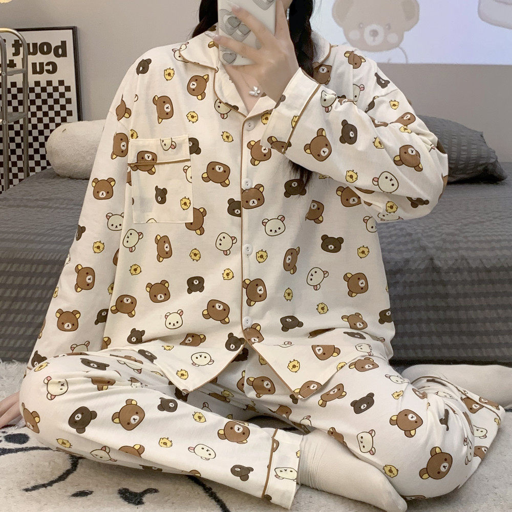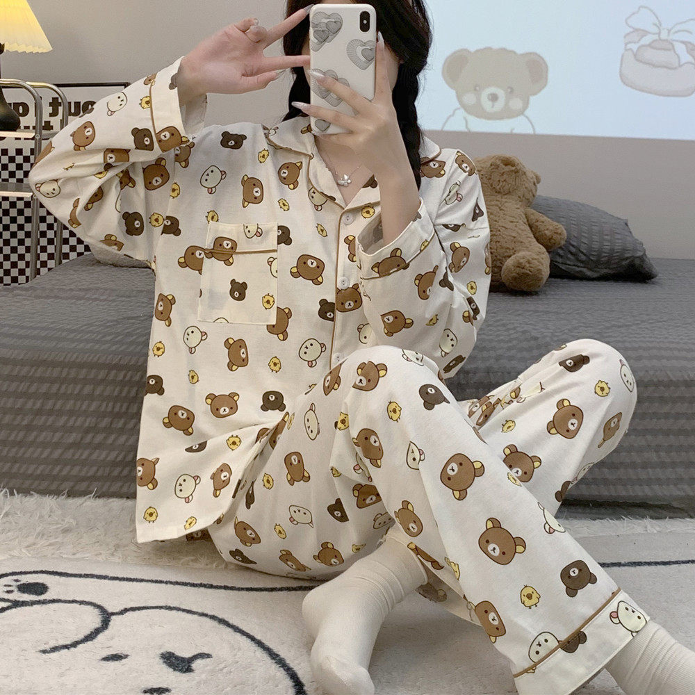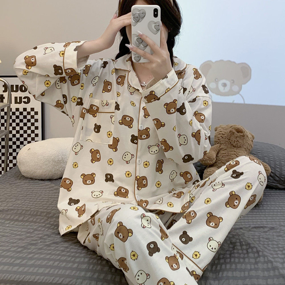 新款 家居服套装 纯棉长袖 男士 可爱学生大码 轻松熊情侣睡衣女春秋季