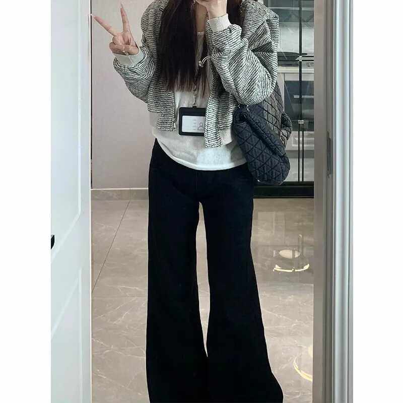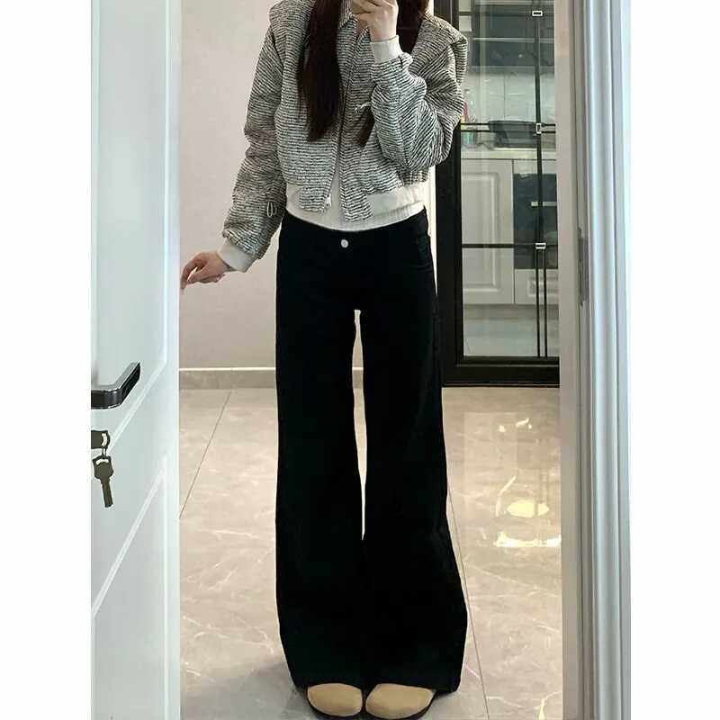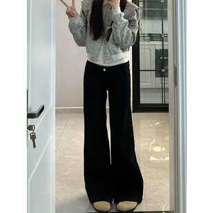 辣妹小个子低腰宽松显瘦阔腿裤 秋季 复古微喇叭黑色牛仔裤 女士时尚
