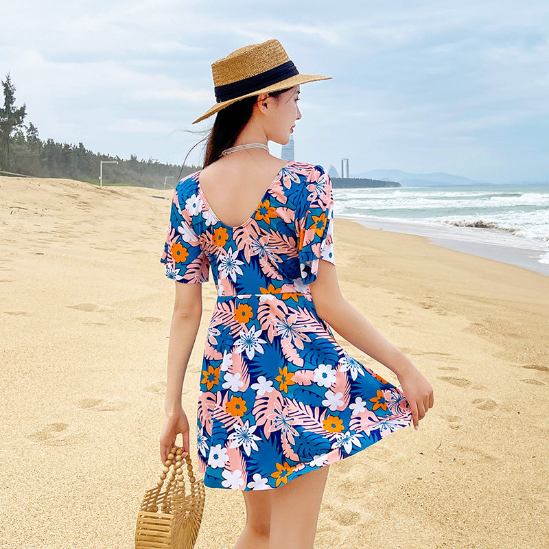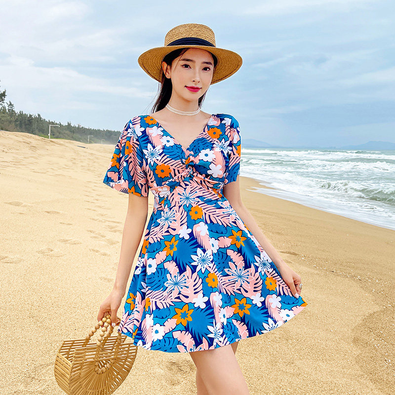 大胸聚拢泡温泉泳装 大码 连体印花裙式 遮肚保守时尚 泳衣女胖mm新款