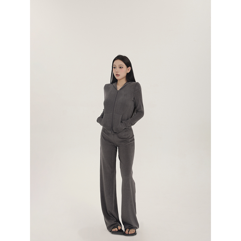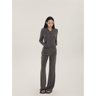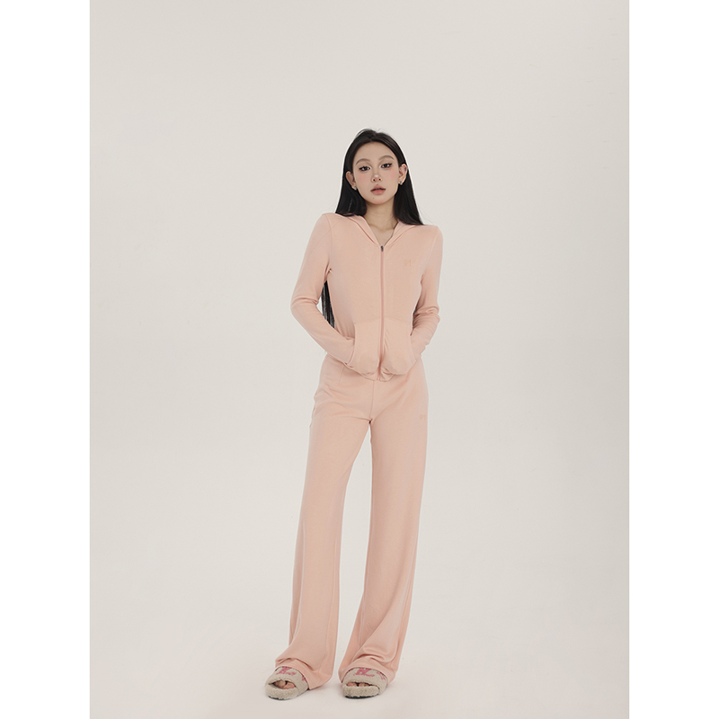 上新显瘦双色针织连帽外套直筒长裤 PEMPL 女春季 套装 子两件套 时尚
