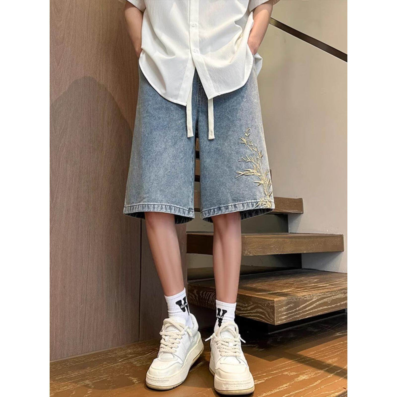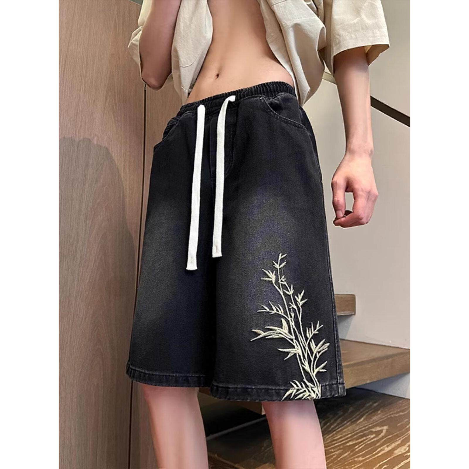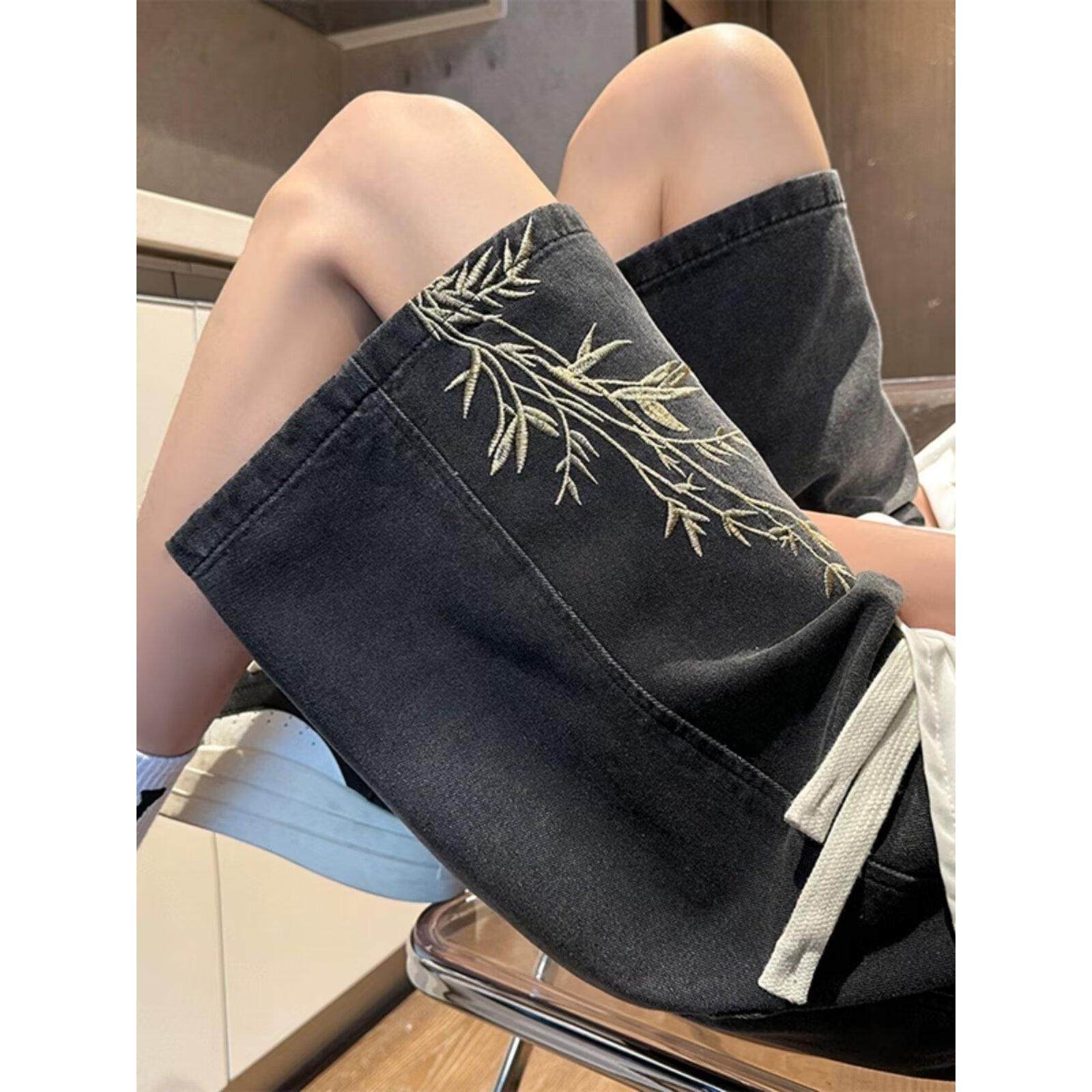 情侣五分裤 男夏季 子 国风竹子刺绣牛仔短裤 上班干活耐穿耐磨新中式