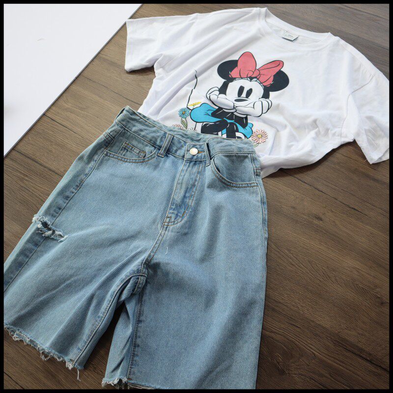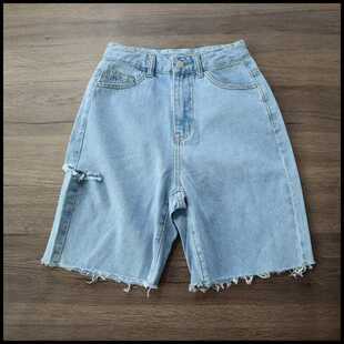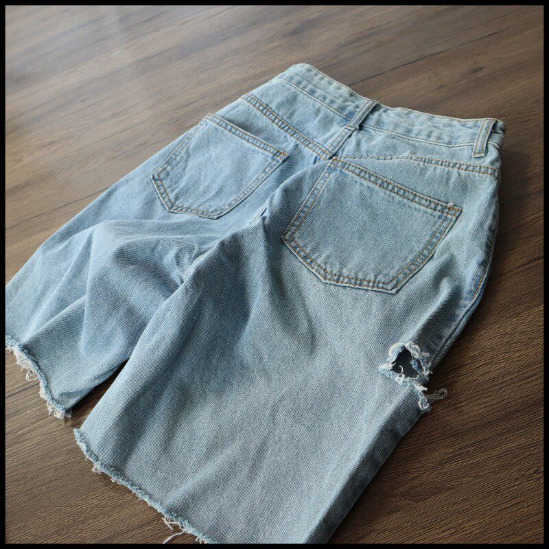 休闲短裤 韩版 时尚 女高腰显瘦蓝色五分短裤 直筒破洞牛仔裤