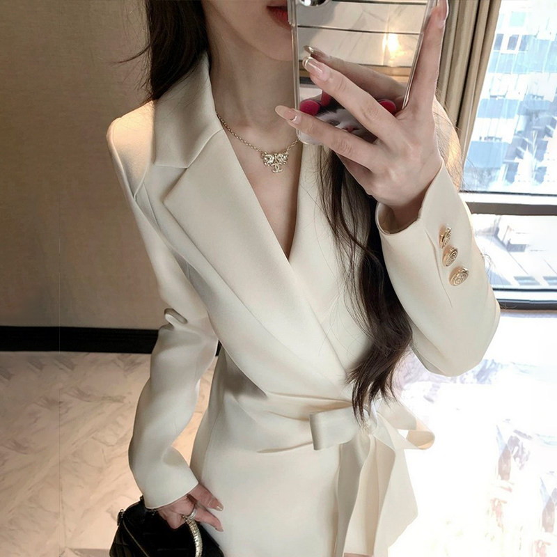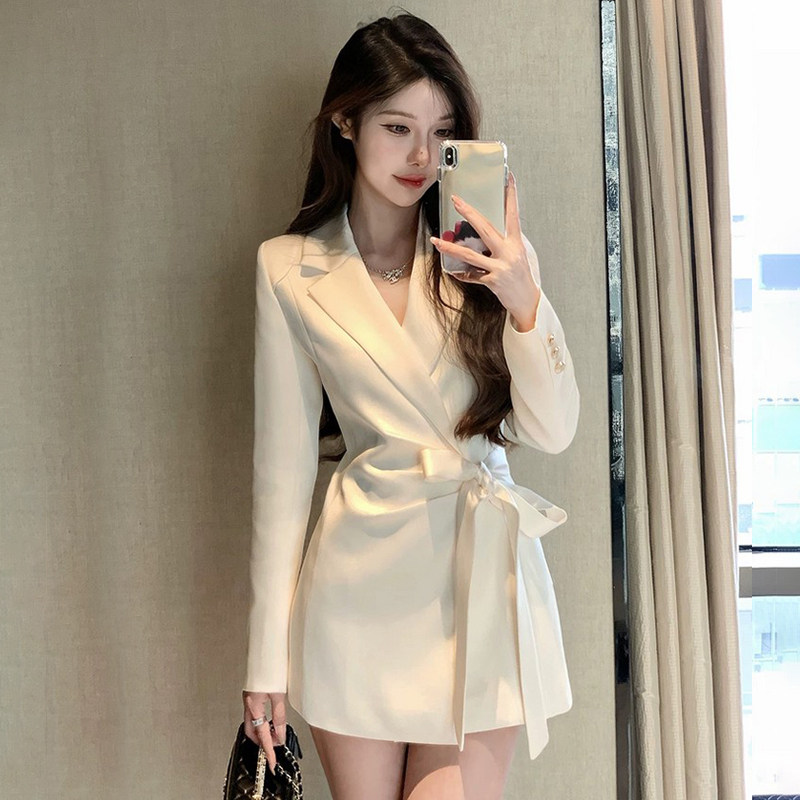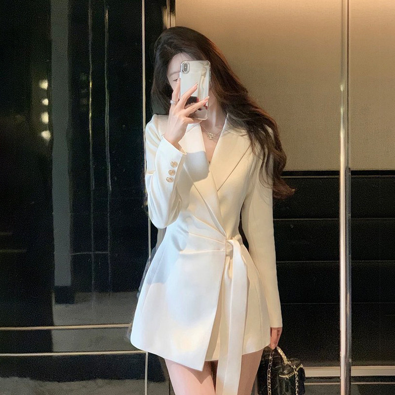 外套连衣裙女设计感小众收腰气质短裙冬季 法式 高级感绑带缎面西装