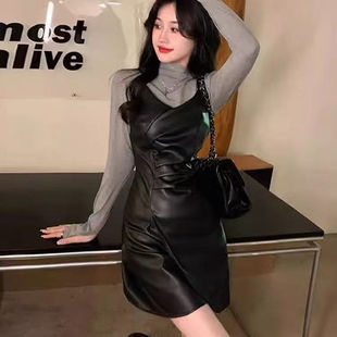 秋冬2024年新款 连衣裙女纯色收腰显瘦针织裙ins 加绒网纱拼接长袖
