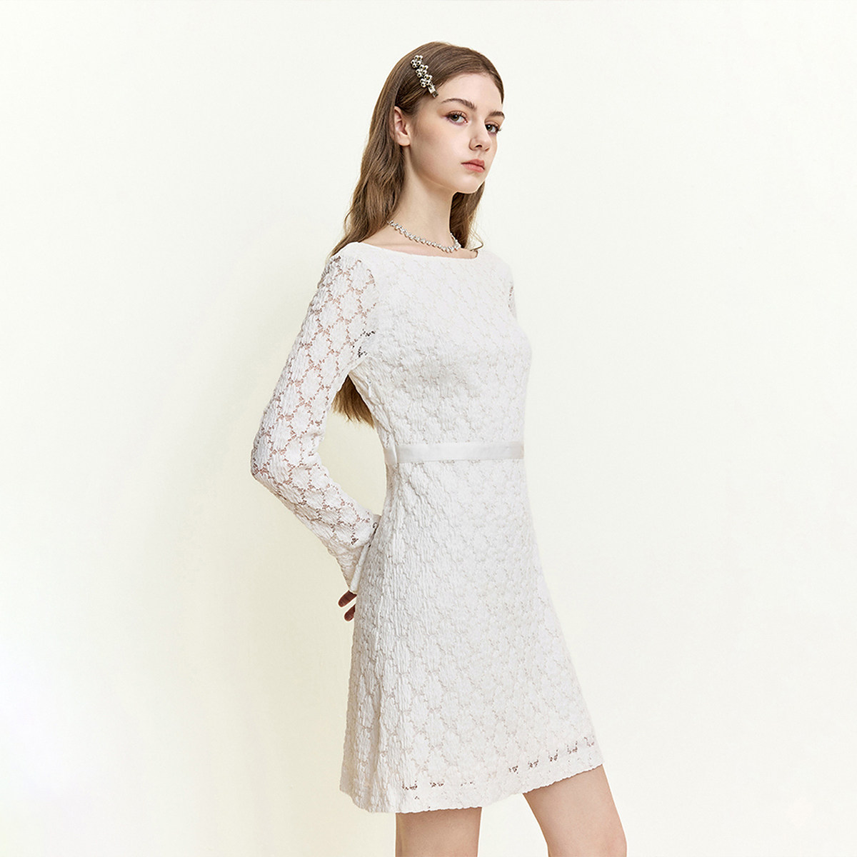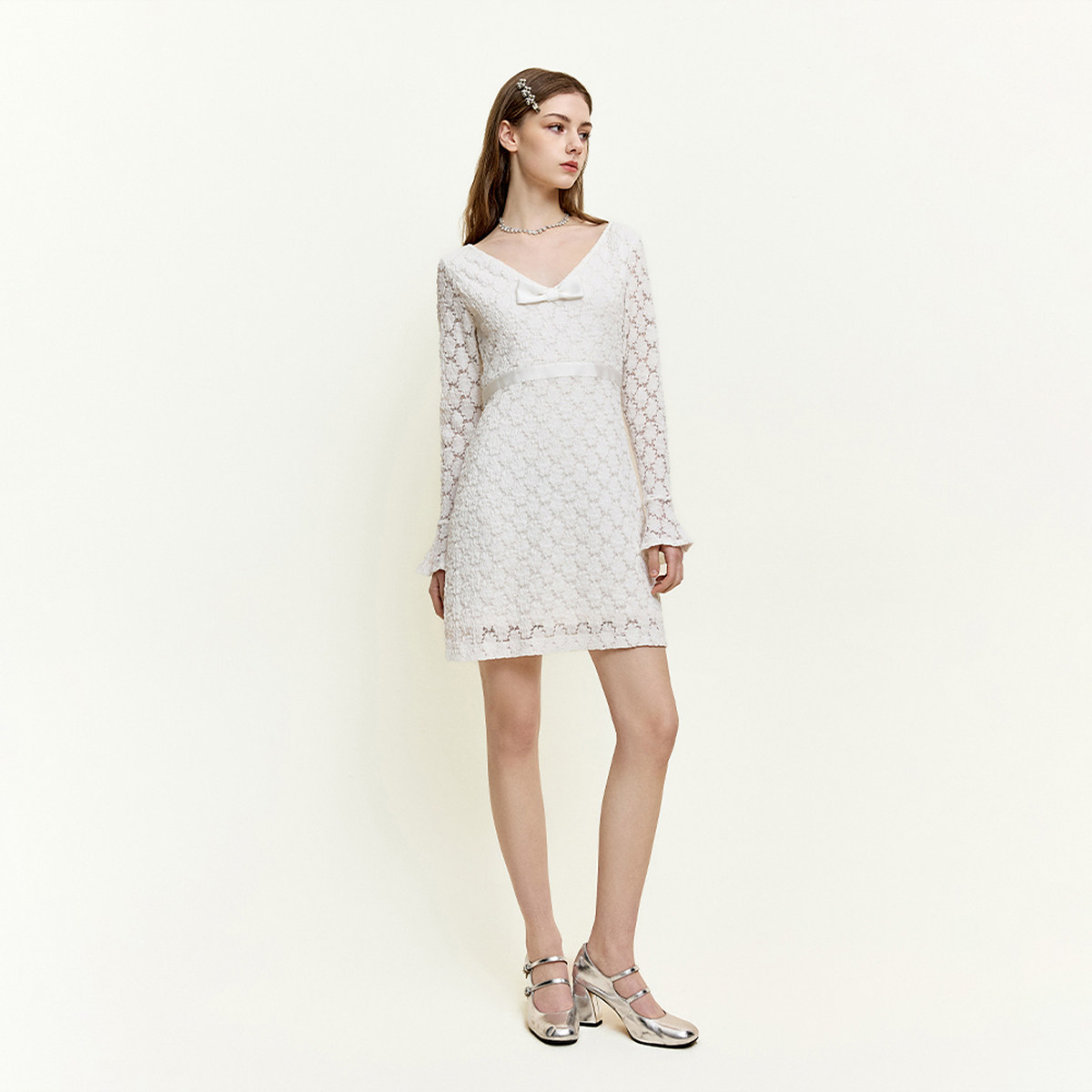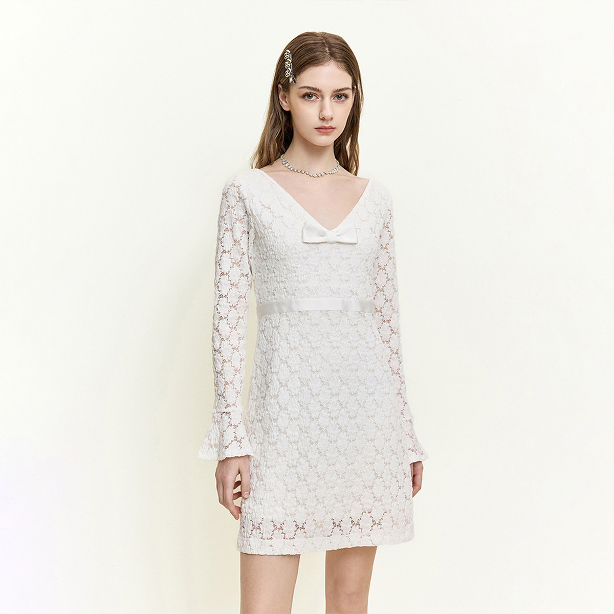 重工蕾丝绣花大V领性感拼接连衣裙女 初雪少女香 你 懒懒llan