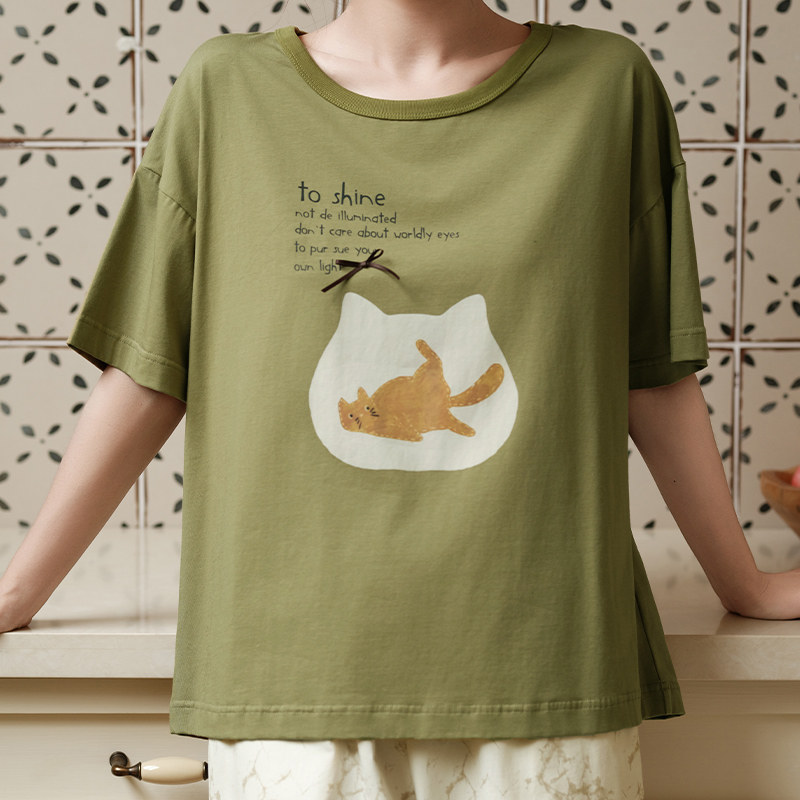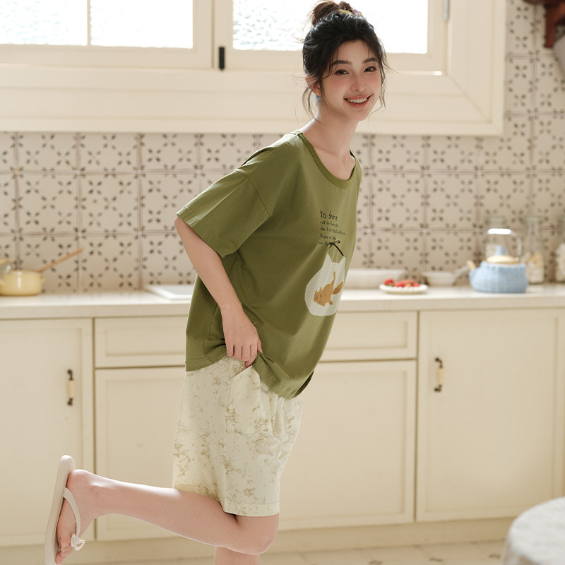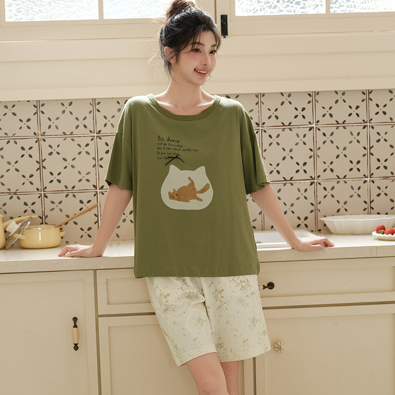 女士睡衣薄款 可外穿家居服套装 纯棉短袖 宽松休闲夏季 短裤 芬腾夏季