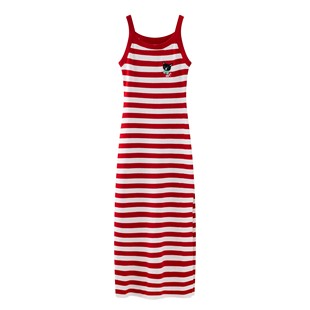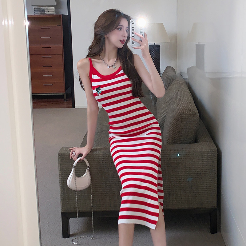 度假风红条纹吊带连衣裙女2022年夏季 宽松显瘦开叉针织背心长裙子