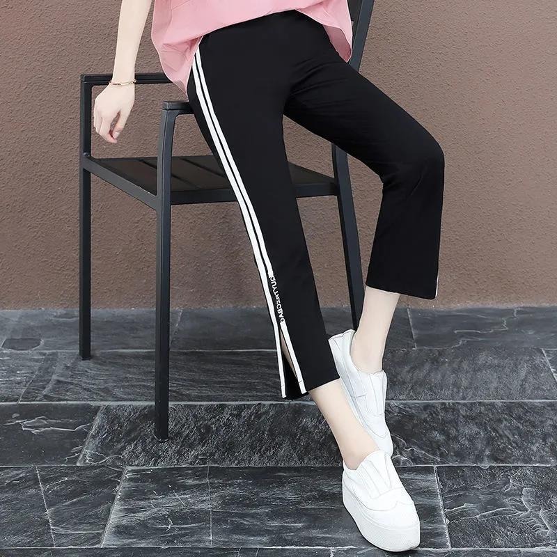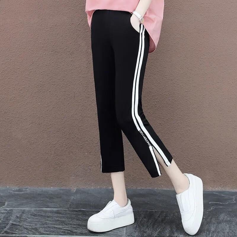 显瘦松紧七分休闲裤 侧条纹哈伦裤 女2026年春夏季 高腰开叉运动裤
