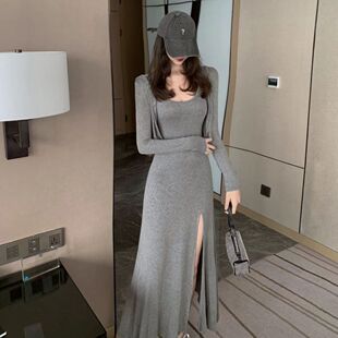 外套高开叉长裙两件套 开衫 莫代尔黑色大码 巨显瘦连衣裙女胖mm夏季