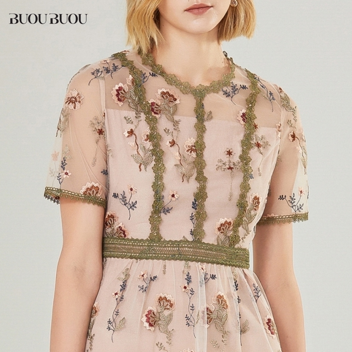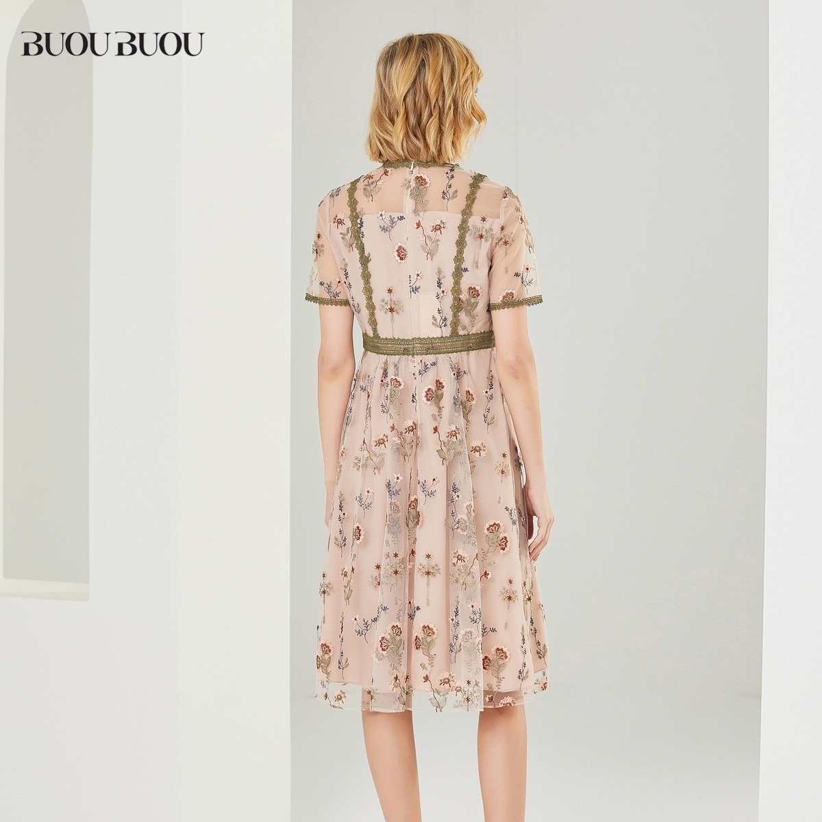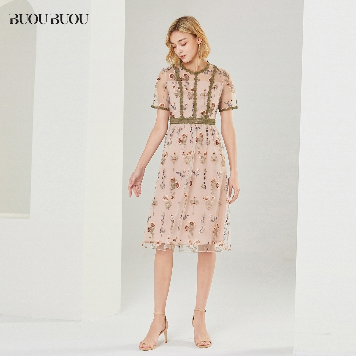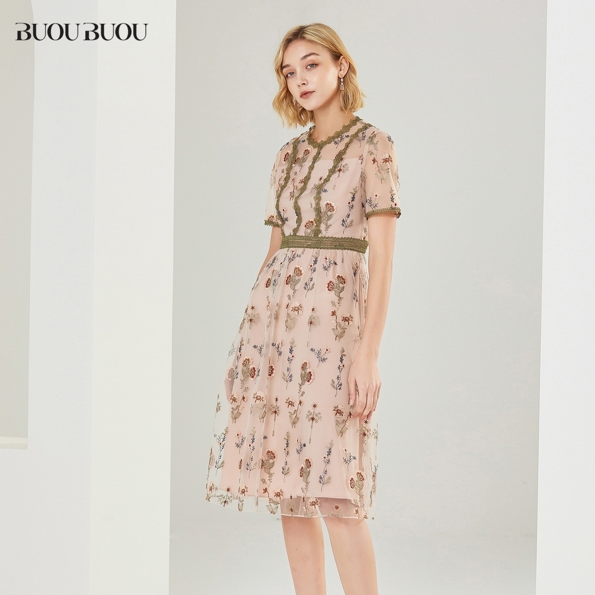 关注领券 拼接蕾丝刺绣短袖 Buou 修身 连衣裙女DI2G804 Buou新品
