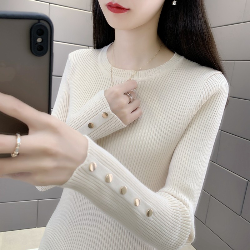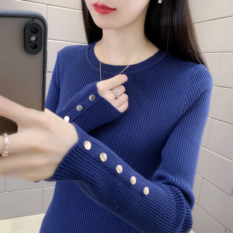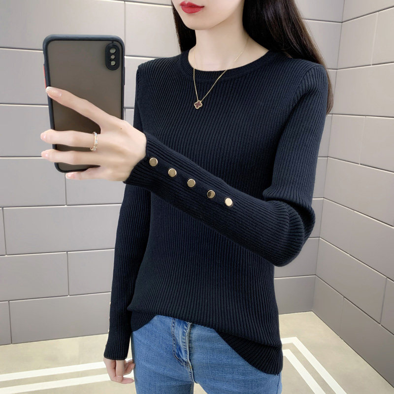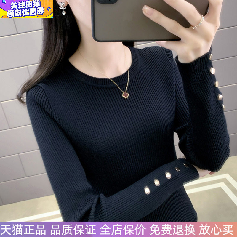 加厚毛衣女装 女气质上衣洋气内搭打底衫 铜纽扣针织衫 黑色圆领修身