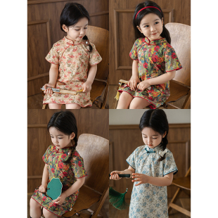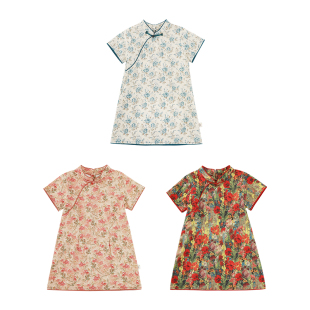幼悠女童浓芳花束数码 柔美婉约一字盘扣连身裙潮 印花旗袍2025夏季