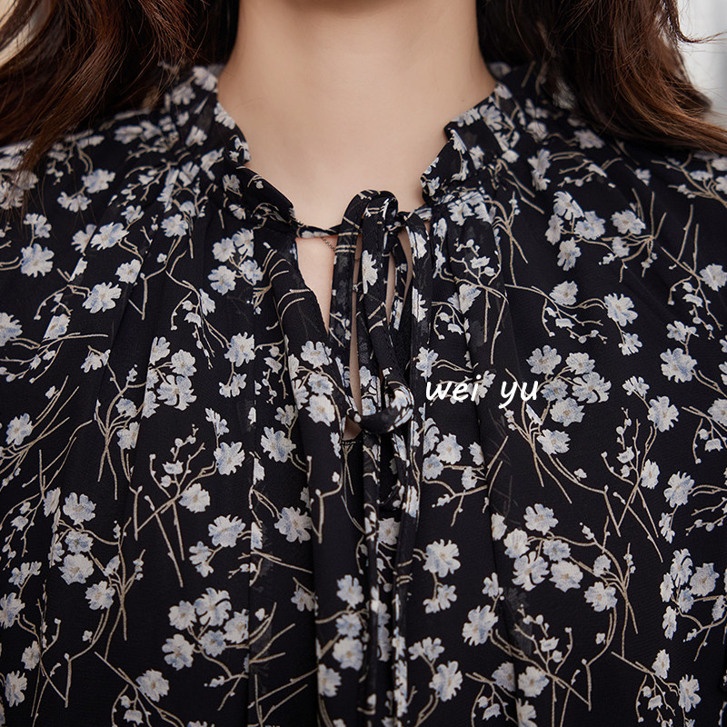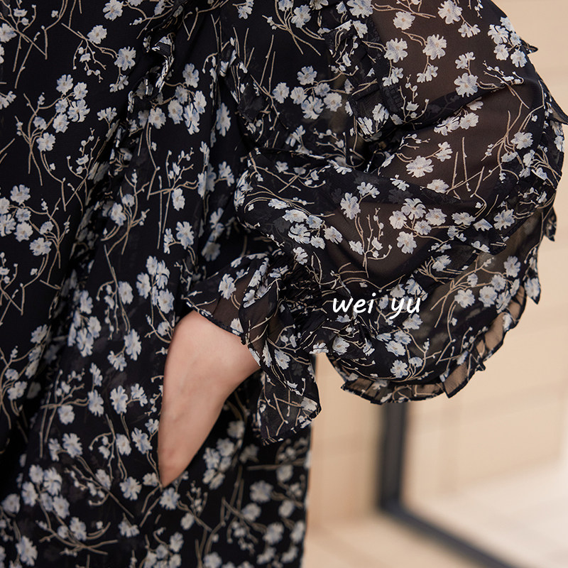 宽松法式 薇语大码 显瘦长袖 碎花雪纺连衣裙2024春夏新款 长裙 女装