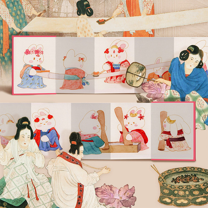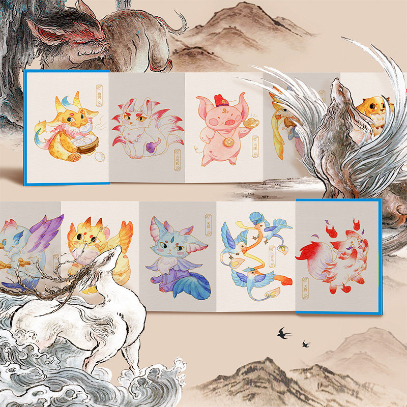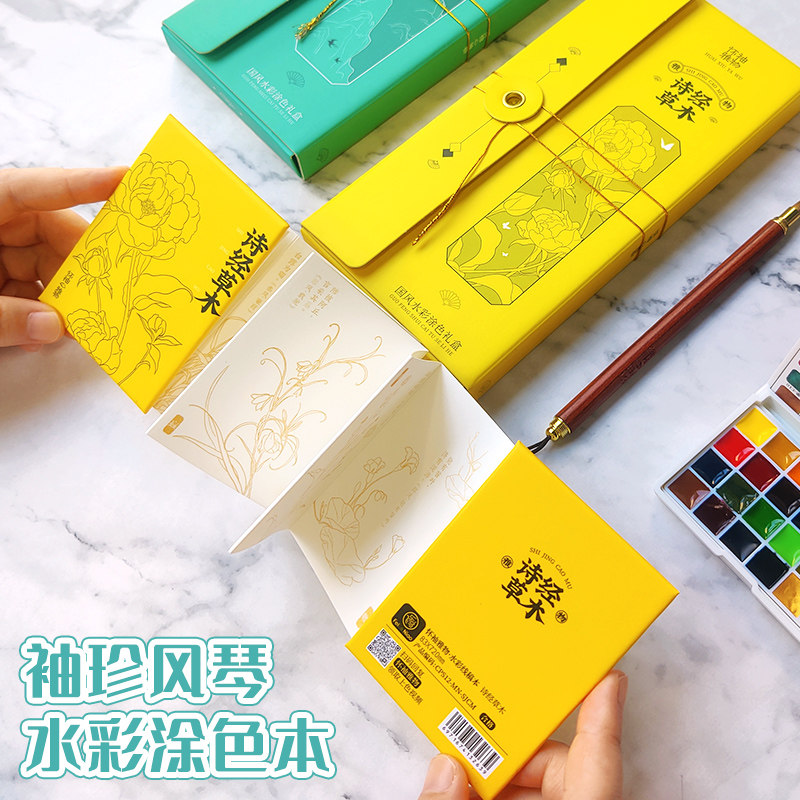雅物飞乐鸟 Mini水彩线稿填色本 宫猫山海经敦煌怀袖 奏折拉页 轻松解压成人涂色水彩画画本子 涂色巴掌本豆本