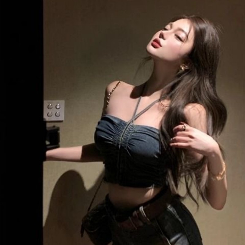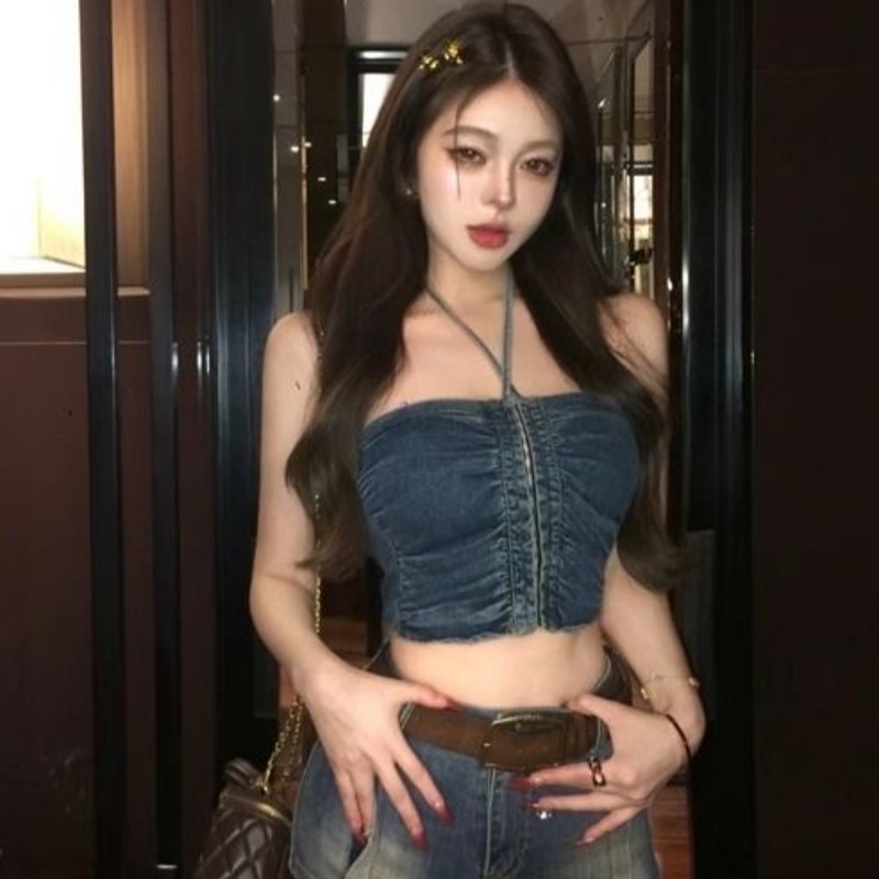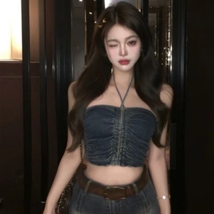 泰式 y2k辣妹牛仔挂脖吊带背心女夏性感一字肩鱼骨抹胸小上衣绝美