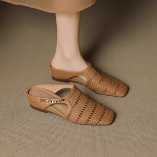 金扣羊皮编织镂空包头半拖女内增高穆勒鞋 小众设计~ 复古法式