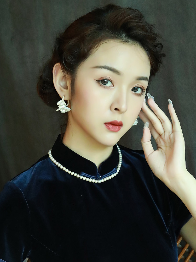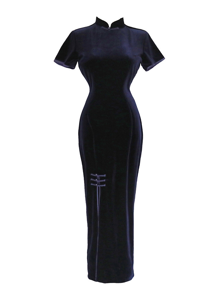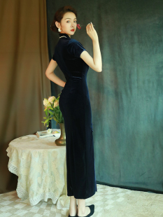 秋季 中长款 高端连衣裙性感时尚 藏青色丝绒旗袍女复古中国风改良版